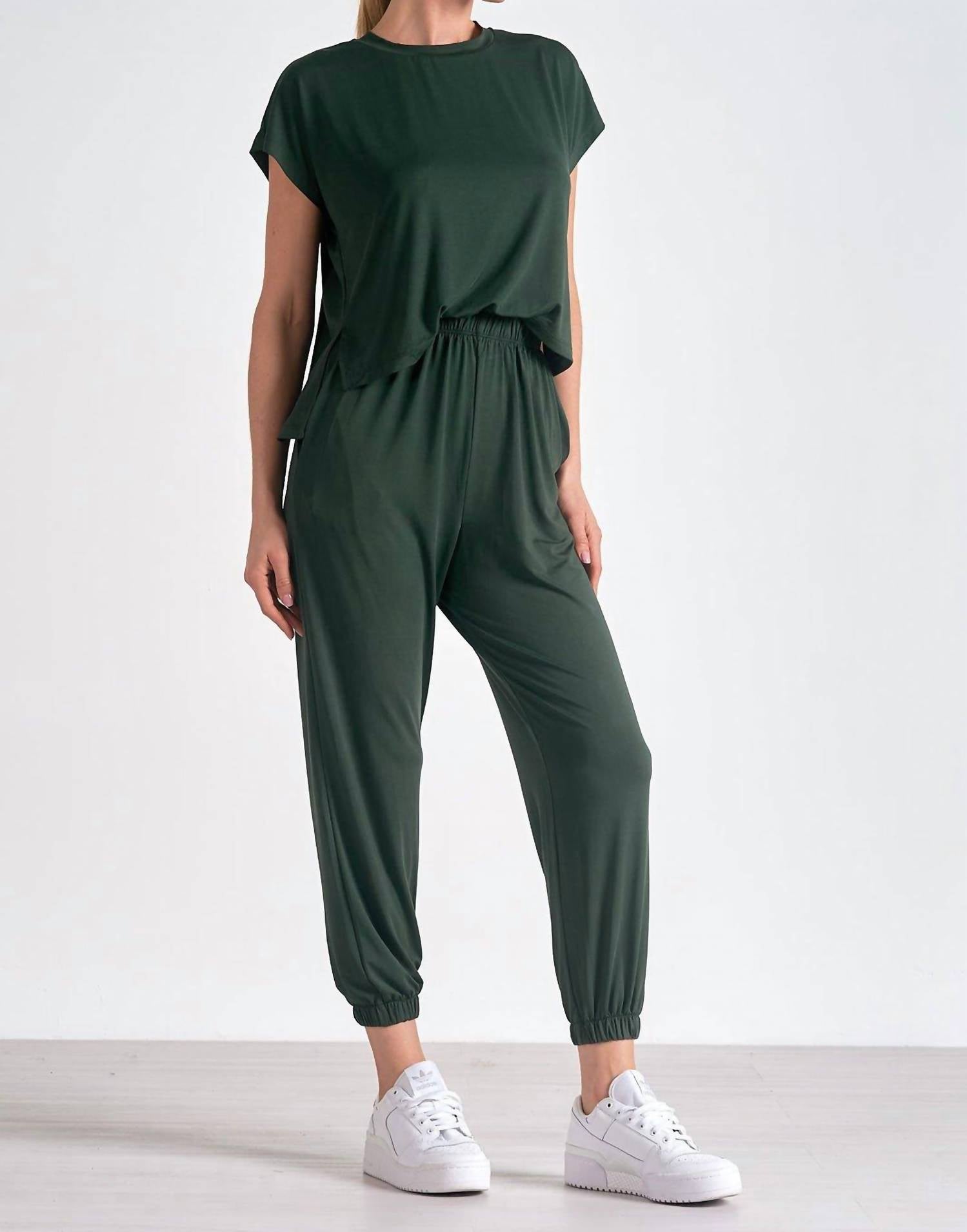 Elevate your summer wardrobe with the T-shirt Jumpsuit in Dark Green by Elan, exuding a chic Y2K flair perfect for St. Patrick's Day or any vacation. Crafted with short sleeves in a beautiful blend of 72% Modal, 24% Polyester, and 4% Spandex, this solid jumpsuit offers both style and comfort. It features a pull-on closure with a high-rise, elastic waistband, relaxed fit, and tapered leg design, complete with pockets for added practicality. Embrace the ease of its supremely soft fabric that flows with your movement, effortlessly combining sophistication with a relaxed vibe.