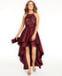 Glitter lace bodice; tiered high-low skirt|Back zipper closure; keyhole and button closure at back neck|Halter neckline; fit & flare silhouette|Imported