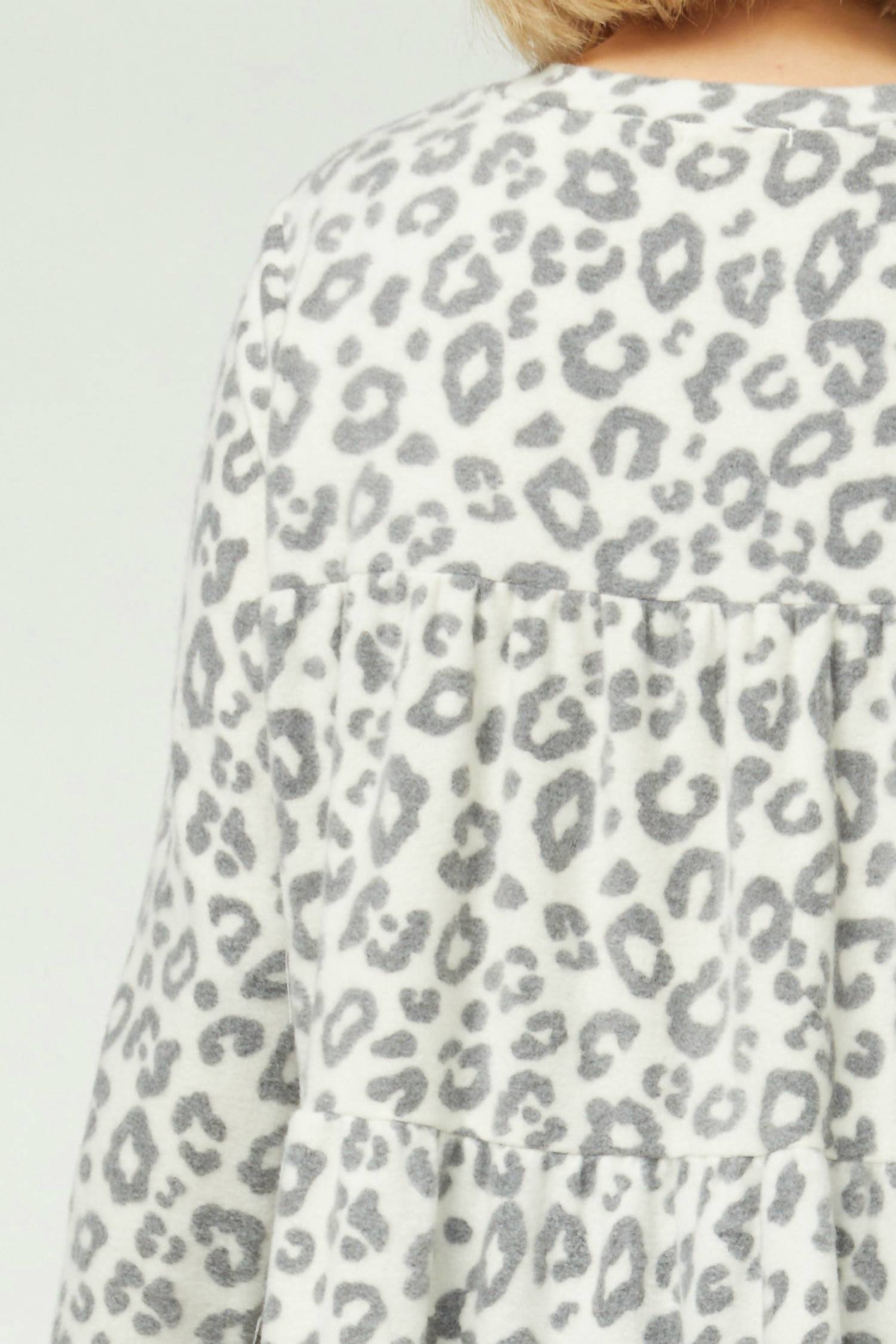 Pair this with your favorite jeans and slides for your next girls night out. Elevate your casual wardrobe with the Animal Print Tiered Top by Entro, a cozy and stylish addition featuring a chic crewneck and long sleeves in a striking white and black animal print. Crafted from a soft blend of 63% Polyester, 34% Rayon, and 3% Spandex, this American-made piece offers a relaxed, oversized a-line fit with a tiered body for extra flair. The pull-on style makes it effortless to wear, and it's easy to maintain with hand wash or dry clean options. Available in sizes XL to 2X, with bust measurements ranging from 50" to 54" and lengths at 31".