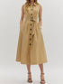 Introducing the Dress Belted With Pleated Skirt & Pockets by Entro, a chic addition to your festive wardrobe in a sophisticated beige hue. This sleeveless, solid-patterned midi dress is crafted from 100% Cotton and showcases a shirt dress silhouette with a collar neckline for a timeless look. A flattering elasticated back waist and removable self-belt provide personalized comfort, while the accent button closure adds a sleek finish. Designed with practical side pockets, this versatile piece offers endless styling possibilities, ideal for spring occasions like a dinner party.