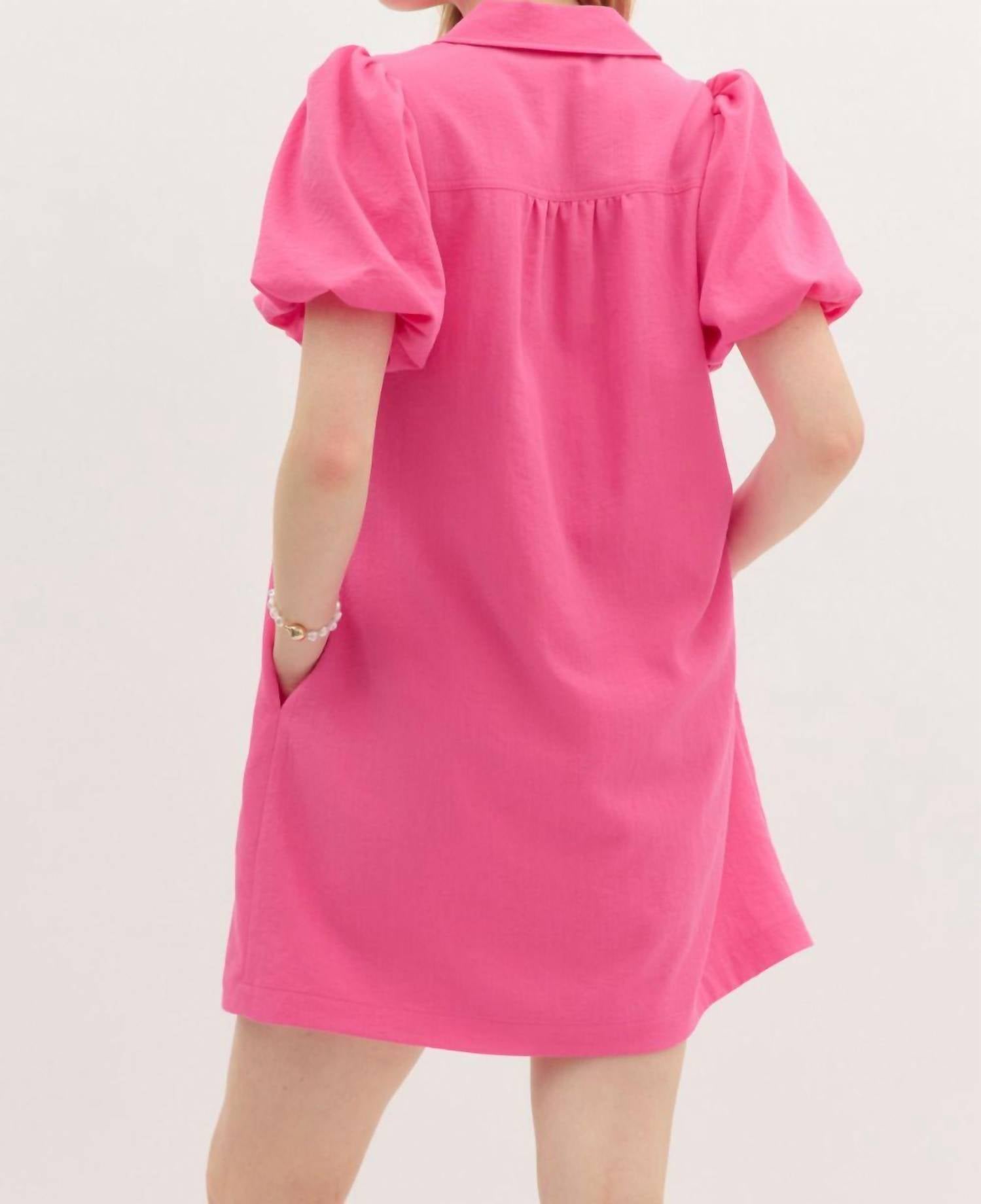 The kind of easy and flattering dress you'll be reaching for all season long. Introducing the Bow Mini Dress by Entro, a chic and playful piece in a vibrant pink hue perfect for spring vacations or workwear. This dress features short bubble sleeves and a spread collar, enhanced by a charming bow accent. Its convenient side pockets add functionality to its solid, lightweight, and non-sheer fabric. Closure: Pull on.