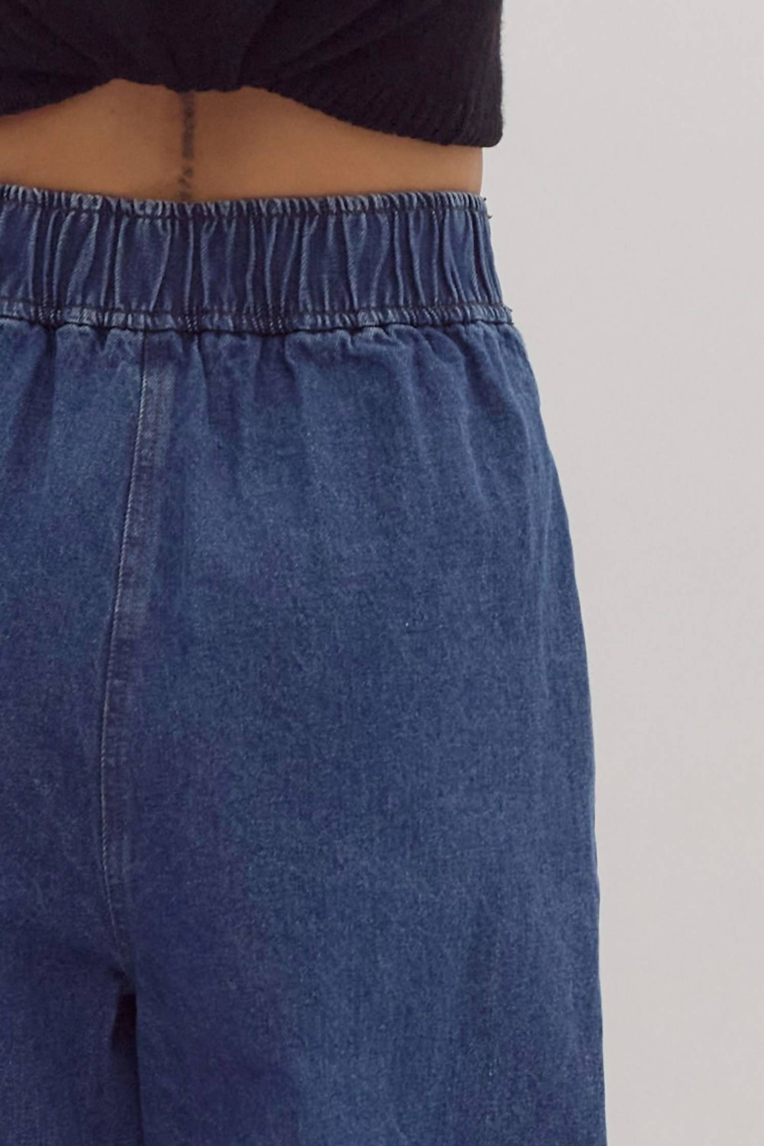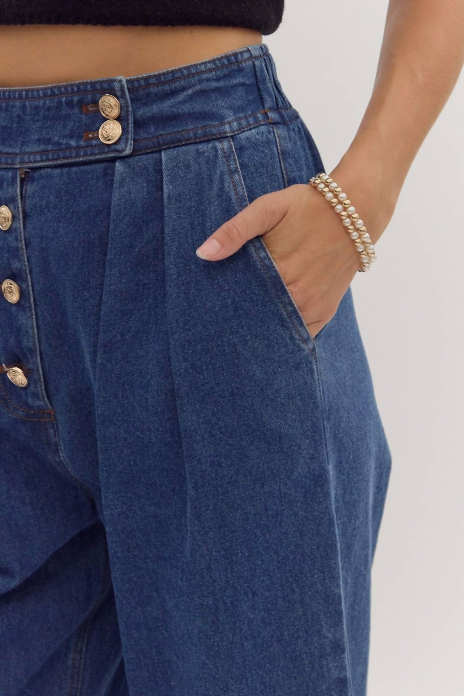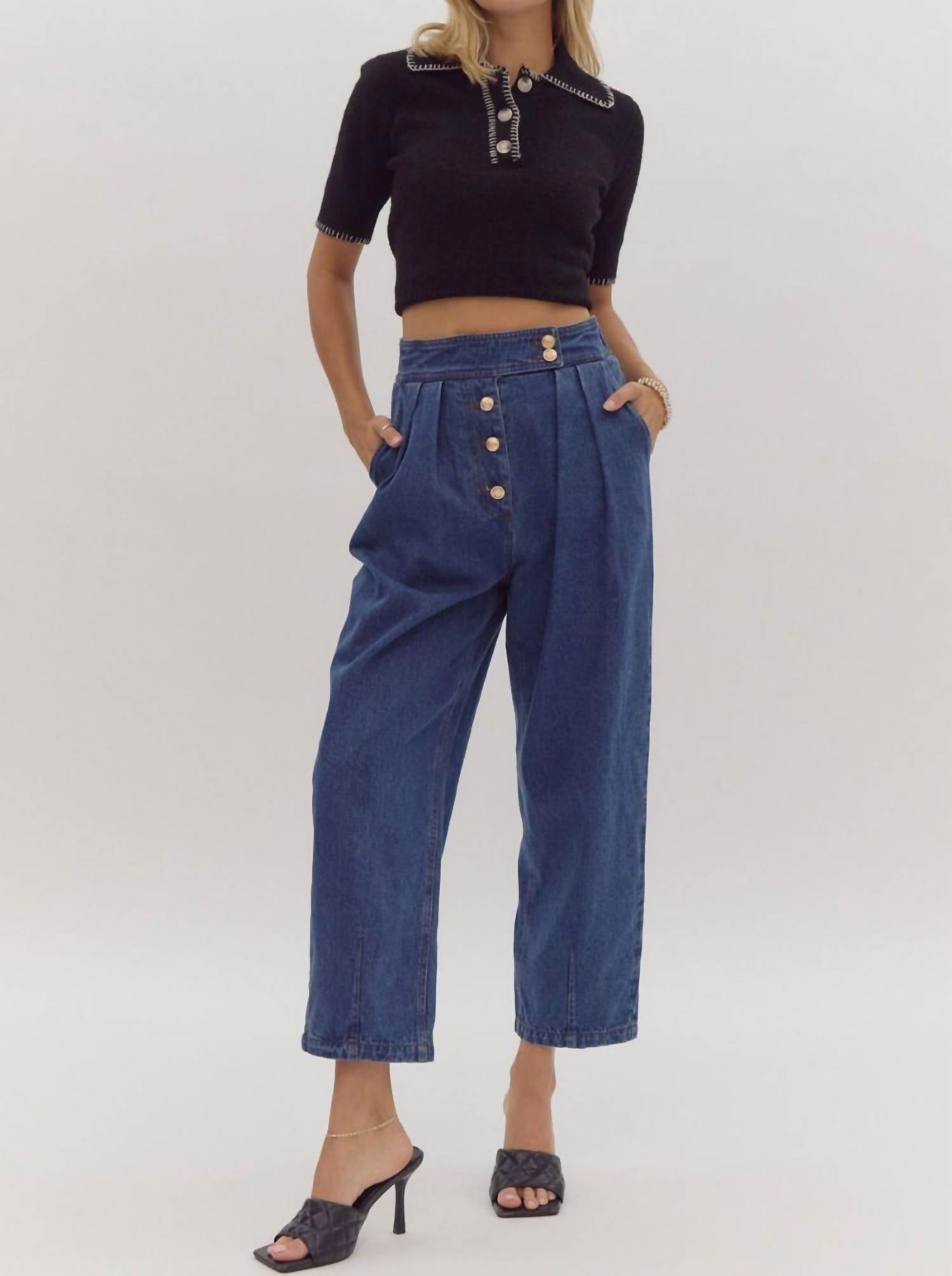Pair these wide leg jeans with mules, slides or your favorite strappy sandals. Meet the "Call You Later" Cropped Pants by Entro, designed in an elegant dark denim hue. These pants feature a high waist with pleated detailing and a stylish, accented anchor button front closure, complemented by an elasticated back waistband for added comfort. The solid pattern combined with practical pockets adds to their midweight construction, ensuring both fashion and functionality.
