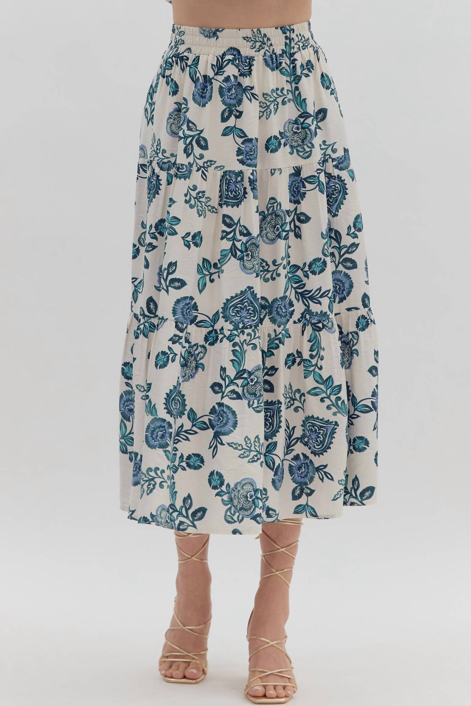 Tuck your favorite tee into this midi length skirt for an effortlessly cool look. Introducing the Camille Floral Midi Skirt by Entro, a chic addition to your wardrobe in vibrant Oyster, Peacock, and Marine Navy hues. This women's tiered skirt features a lively large-scale floral pattern, elastic waistband, and convenient pockets for added functionality. Crafted from 80% Rayon and 20% Nylon with a 100% Polyester lining, this 35-inch midi length skirt offers a comfortable pull-on closure. Care instructions include hand washing only. The perfect choice for spring occasions, from Easter celebrations to vacation getaways.