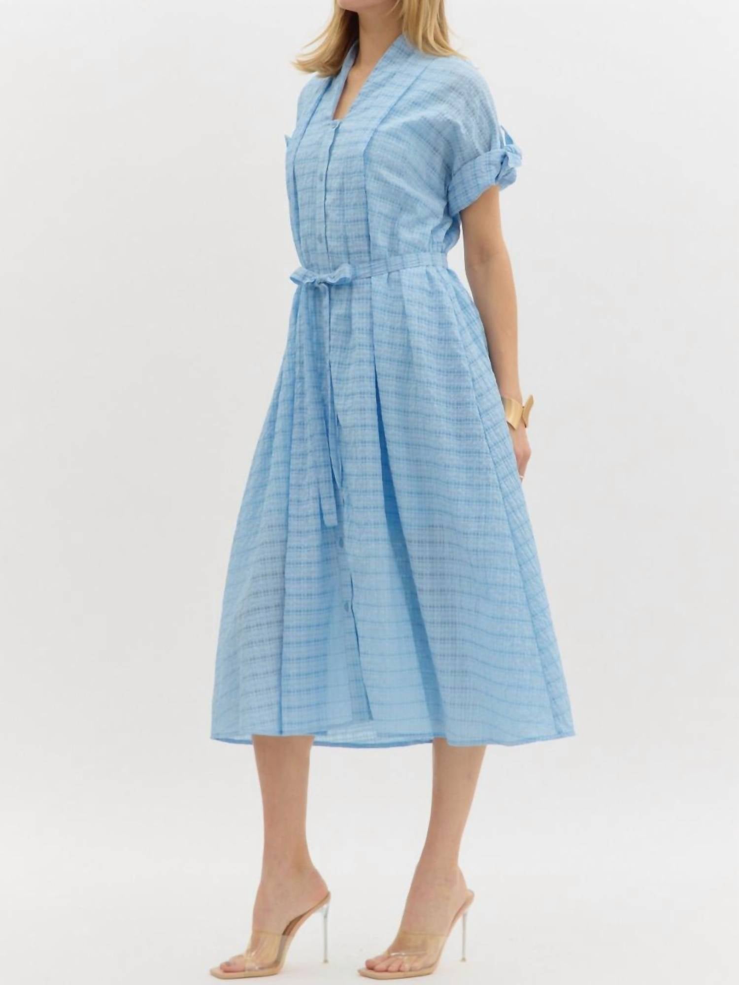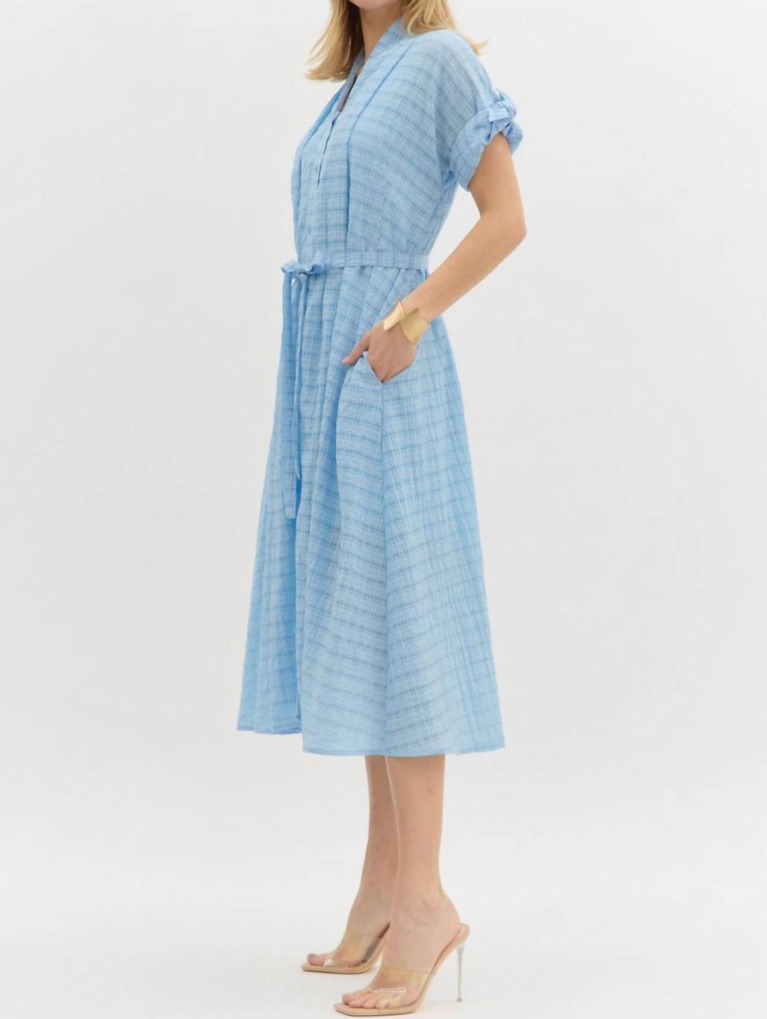 Just add slides or mules and you are good to go. Introducing the Entro Carolina Button Dress in a charming Carolina blue hue, perfect for a boho chic summer look. This A-line midi dress features short tie-detail sleeves, a V-neckline, and a stylish button-down front that enhances its effortless appeal. Crafted from a blend of Rayon, Polyester, and Spandex, it includes an adjustable and removable matching belt for a flattering fit. The dress is lined for comfort, making it ideal for vacations or special occasions. Closure: Button closure.