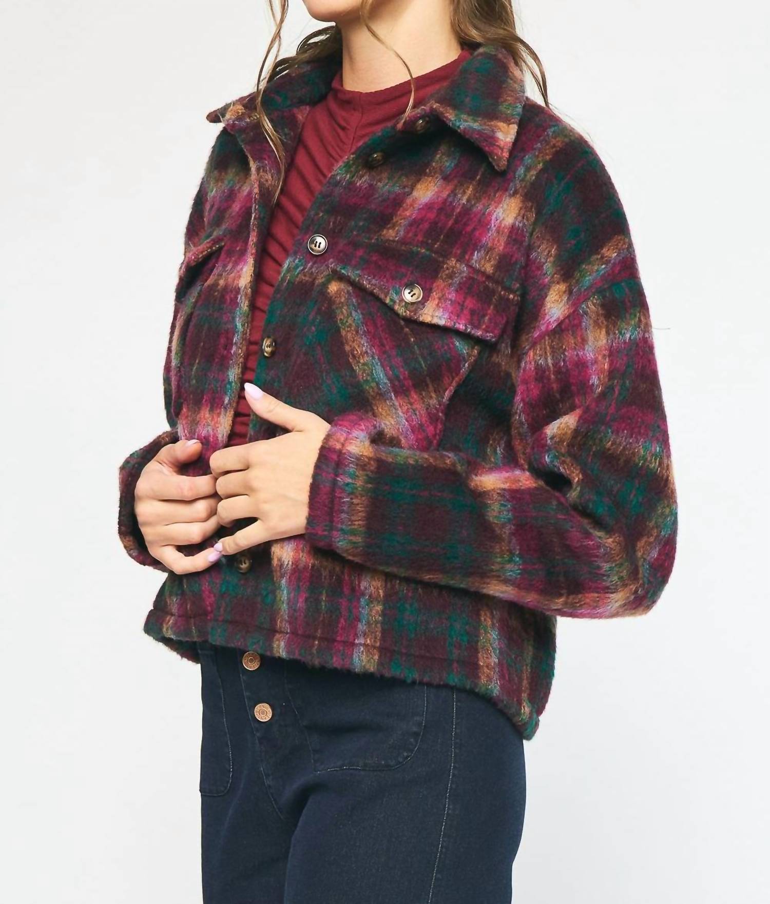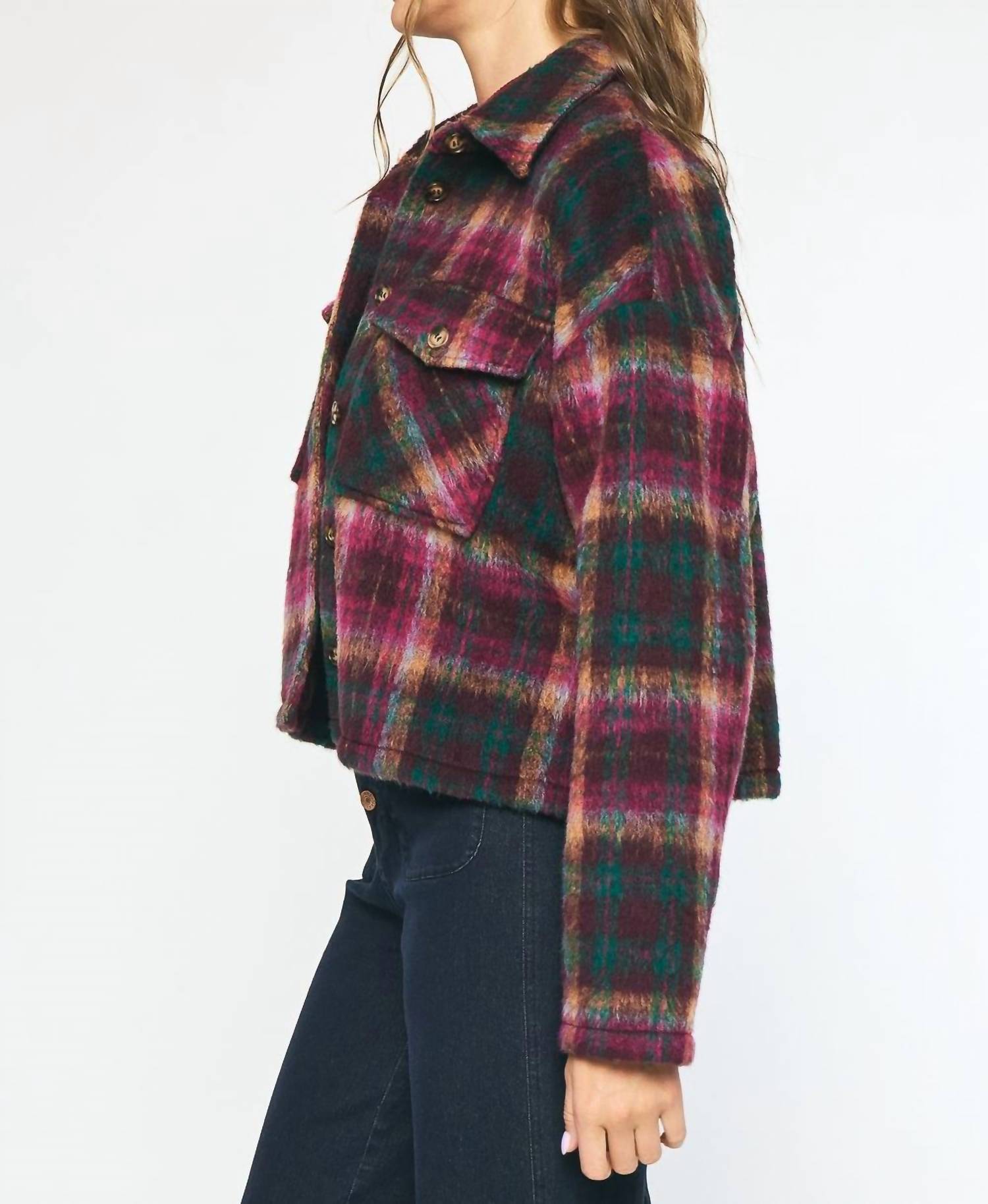 An elevated version of your favorite classic blazer.Faux wool plaid pattern. Cropped long sleeves. Button-up jacket. Flap pocket at bust. Unlined. Woven. Non-sheer. Mediumweight.