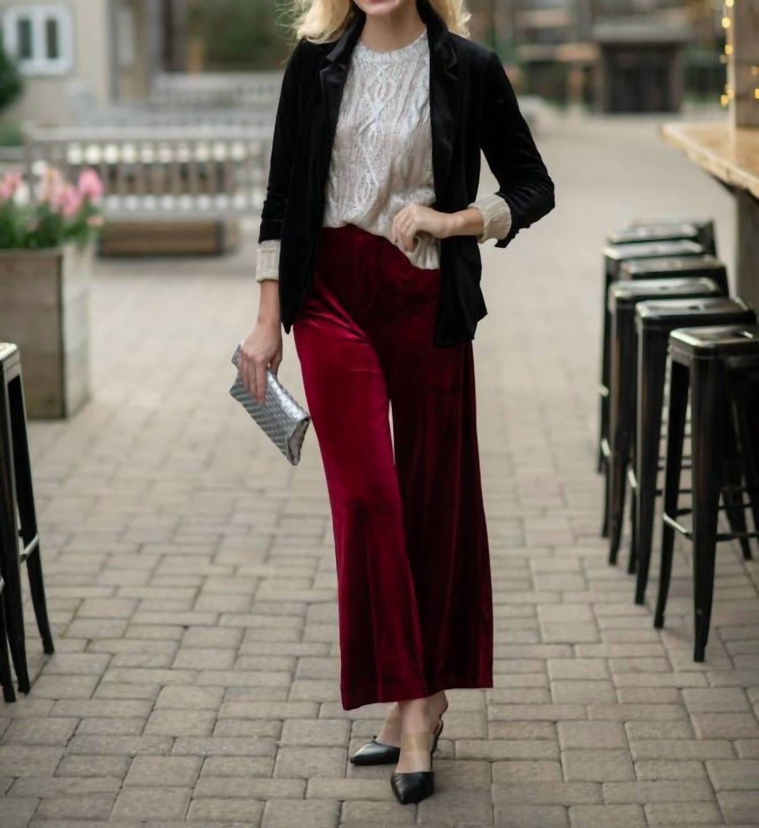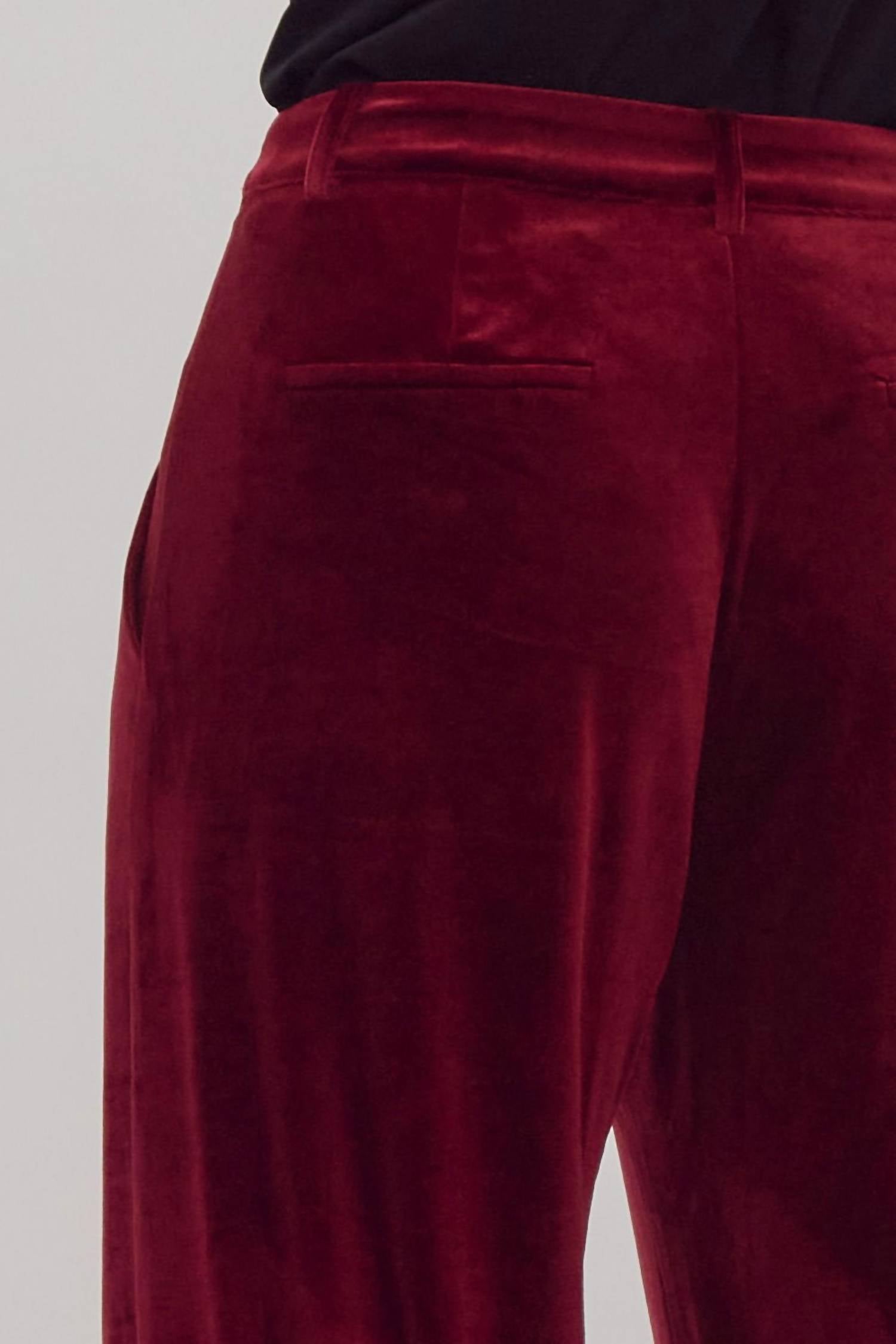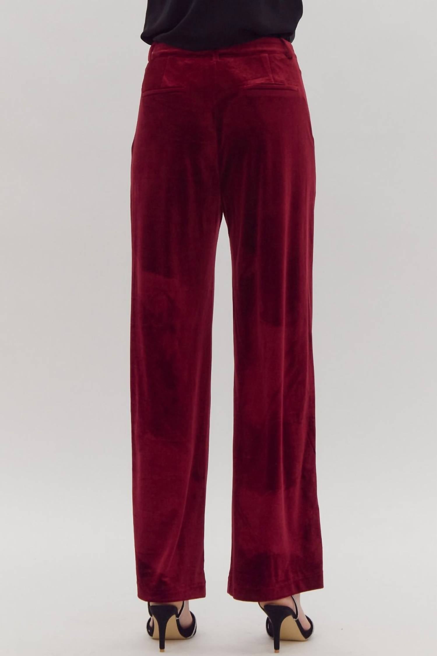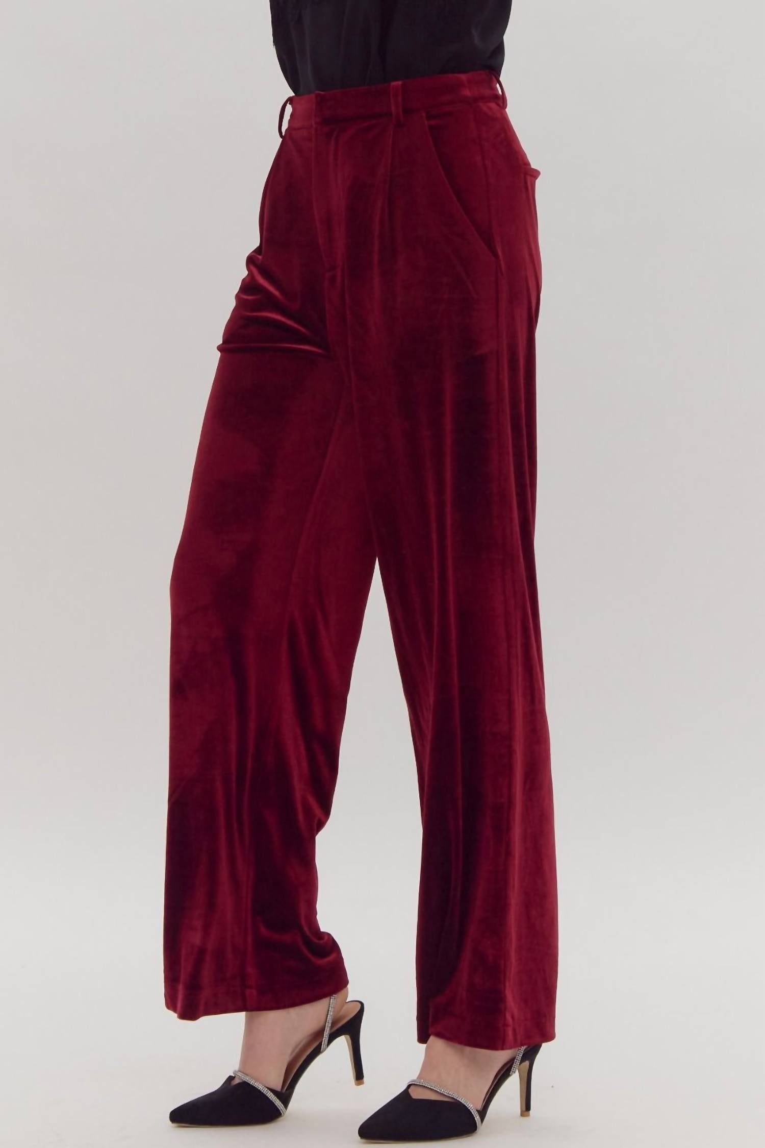 Introducing the Della Trouser by Entro, a chic addition in maroon perfect for elevating your seasonal wardrobe. Crafted from a luxurious blend of 93% Polyester and 7% Spandex, these high-waisted trousers feature a relaxed fit with a wide leg silhouette. Designed with practicality in mind, they include side pockets and a front zip closure. Care for your trousers with hand washing and line drying to maintain their soft velvet texture.