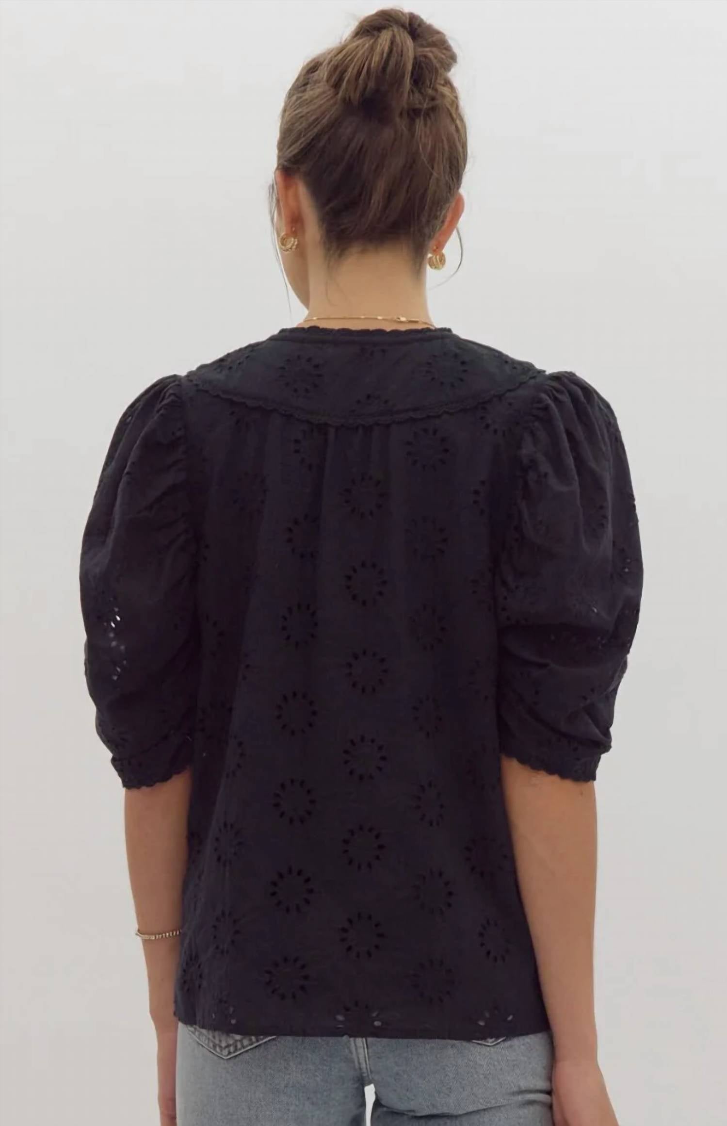 Pair this with your favorite jeans and slides for your next girls night out. The Eyelet Transition Top by Entro is a vintage-inspired blouse perfect for summer vacations, crafted from 100% cotton for a breathable feel. This Women's top in classic black features short puff sleeves and a charming textured pattern. It boasts a split V-neckline with tassels that can be tied for added flair and comes without pockets for a sleek look. Closure: Pull on.