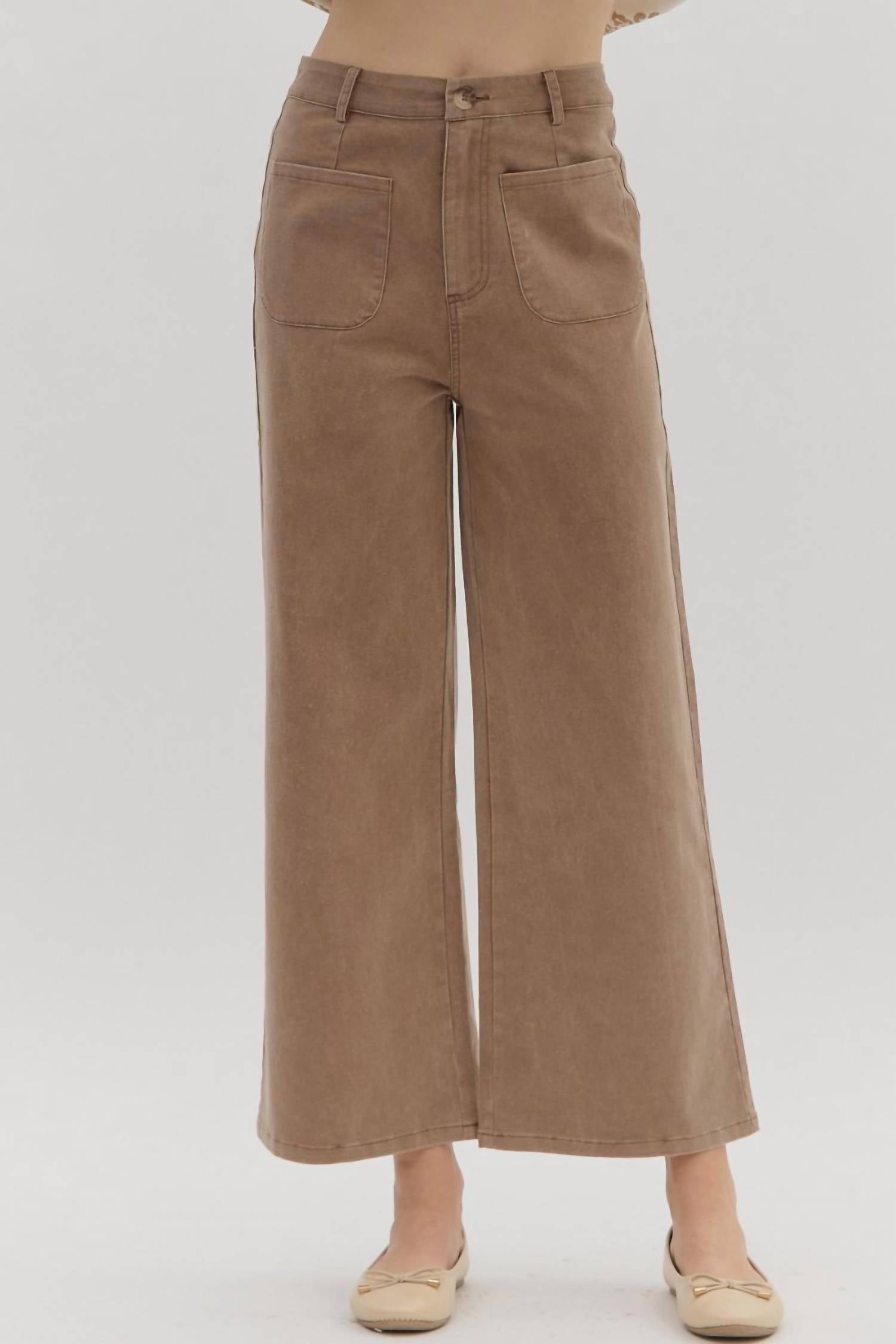 Introducing the High Waist Wide Leg Pocket Pants by Entro, a stylish choice for workwear in a rich brown hue. These solid, ankle-length pants are crafted from comfortable cotton and equipped with patch pockets at the front for convenience, while a faux pocket adds detail at the back. The relaxed fit is enhanced by belt loops and a secure button and zip closure, perfect for a sophisticated look. Care: Machine wash and tumble dry for easy maintenance.