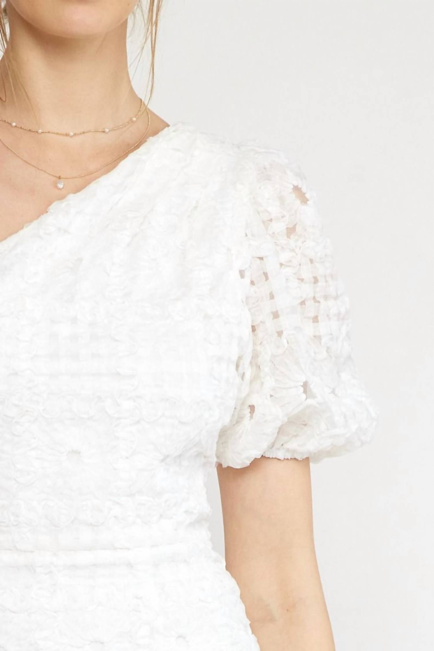 Perfectly tailored and fit to perfection.Floral textured one-shoulder puff sleeve mini dress. Invisible zipper at side. Lined. Woven. Semi-sheer. Lightweight.