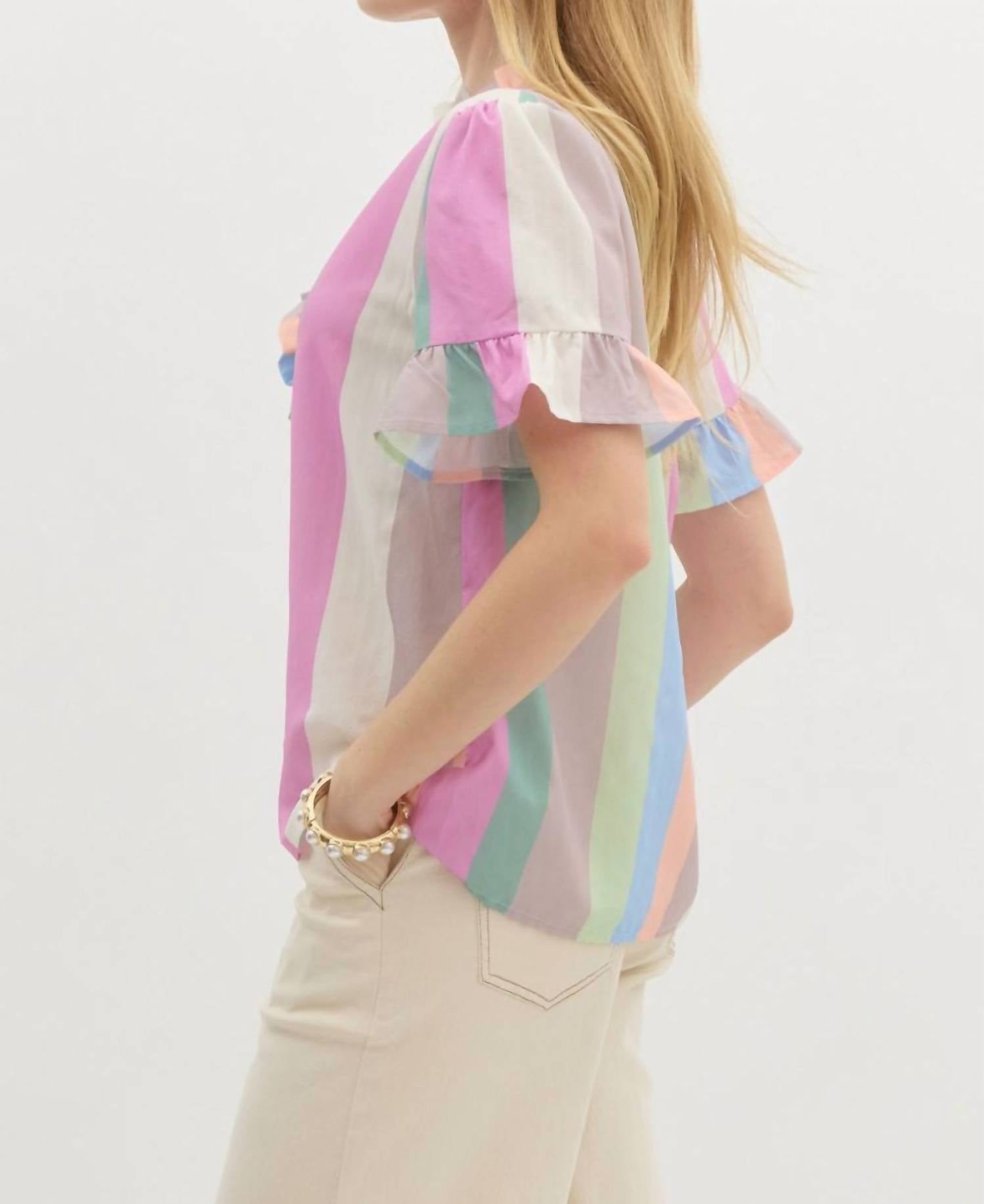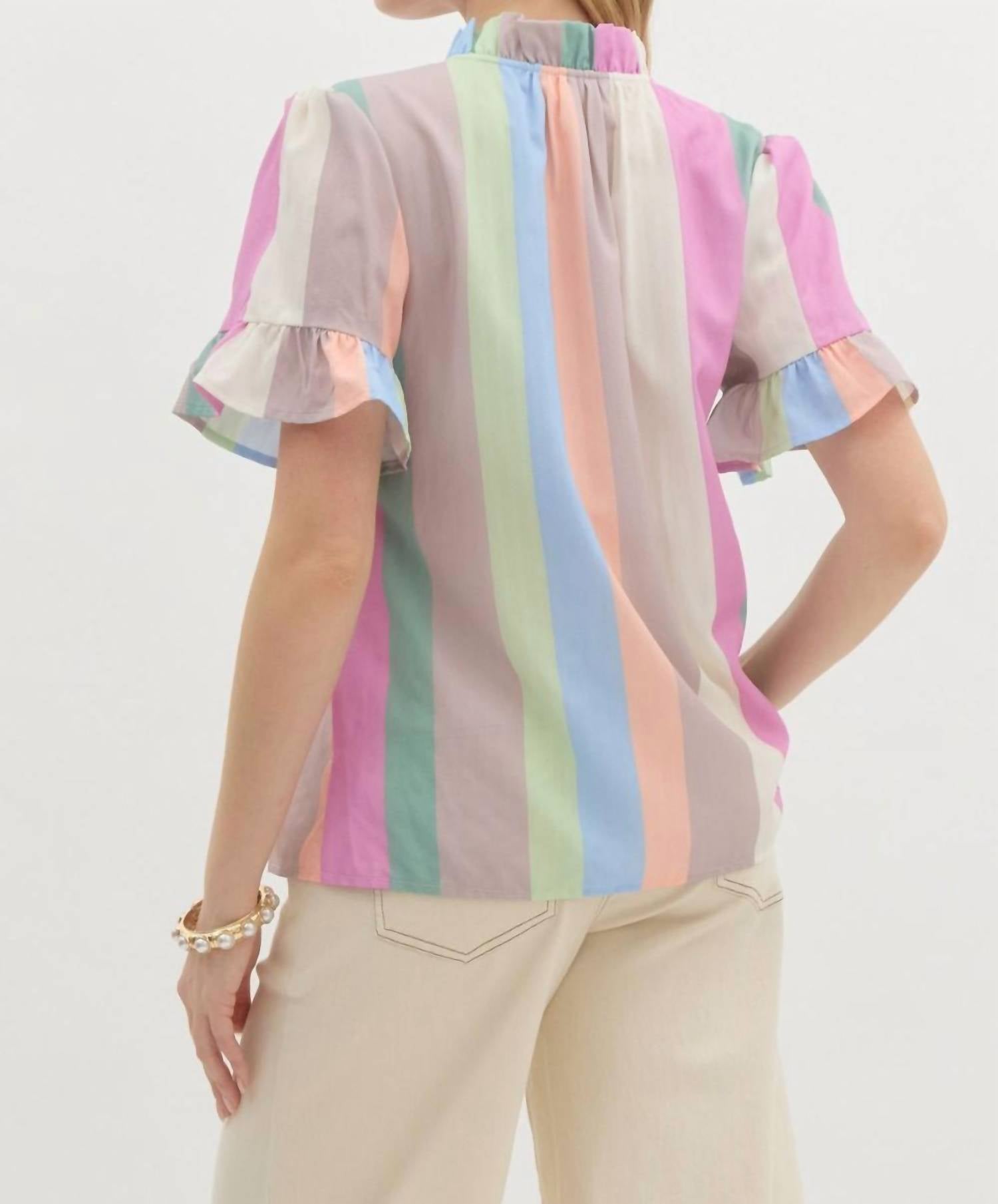 A timeless blouse that will never go out of style. Introducing the Pastel Stripe Blouse by Entro, a charming addition to your wardrobe featuring a wide collar and a playful stripe pattern. This blouse is made from 100% Polyester and showcases short sleeves with elasticated sleeve band openings for a comfortable fit. Closure is managed with a front button closure. Ideal for versatile styling in a multicolored pastel palette.