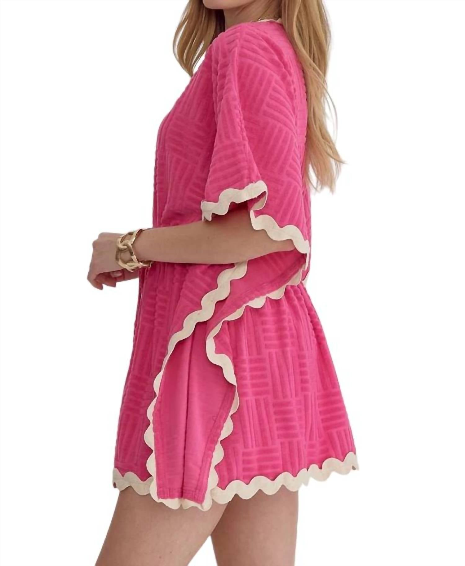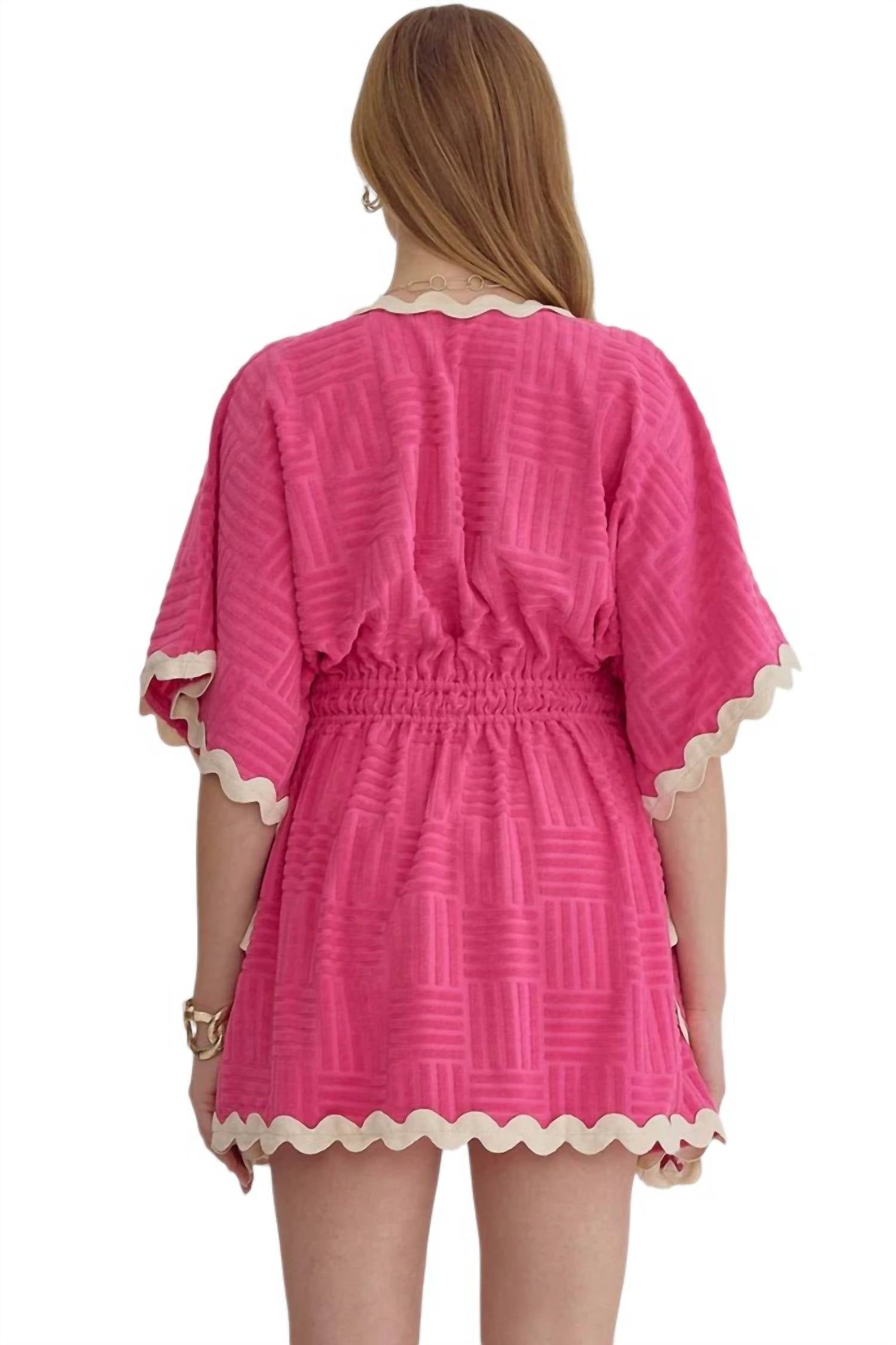A comfy-all-day coverup that works just as good at dinner as it does by the pool.This cover-up is made from textured terry cloth, offering a comfortable and stylish option for layering. It features a V-neckline and half sleeves, complemented by ric rac trim for added detail. The self-tie and elastic at the waist ensure a flattering fit, while the knit fabric is medium-weight, non-sheer, and unlined. Crafted from 100% polyester, this cover-up is both durable and easy to care for, making it an excellent addition to your wardrobe.