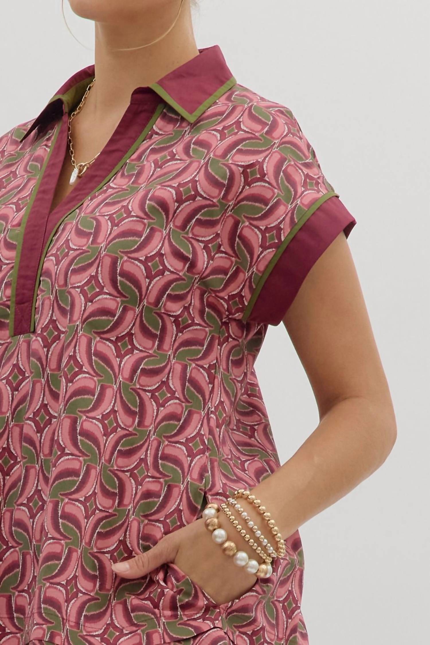 The kind of easy and flattering dress you'll be reaching for all season long. Introducing the Sasha Mini Dress by Entro, a stylish addition in vibrant pink designed for minimalist, effortless style. This dress features short sleeves and a fit-and-flare silhouette with an abstract pattern and flounce ruffle hem. Crafted from 100% cotton, it includes practical side pockets and a contrast accent spread collar. Designed for versatility, it features a convenient pull-on closure and requires machine wash and line drying. Perfect for a spring dinner party or Thanksgiving gathering.