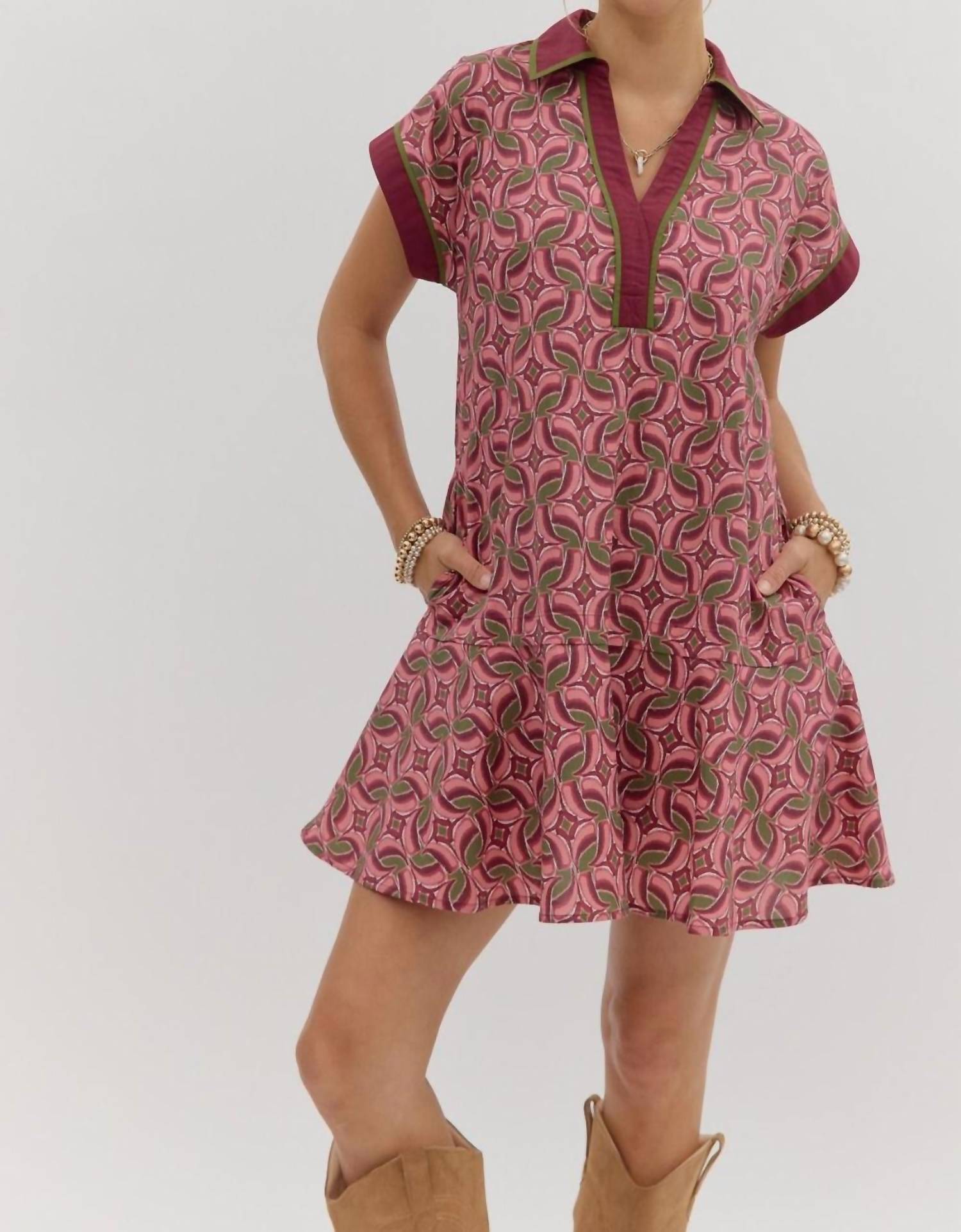 Introducing the Sasha Mini Dress by Entro, a stylish addition in vibrant pink designed for minimalist, effortless style. This dress features short sleeves and a fit-and-flare silhouette with an abstract pattern and flounce ruffle hem. Crafted from 100% cotton, it includes practical side pockets and a contrast accent spread collar. Designed for versatility, it features a convenient pull-on closure and requires machine wash and line drying. Perfect for a spring dinner party or Thanksgiving gathering.