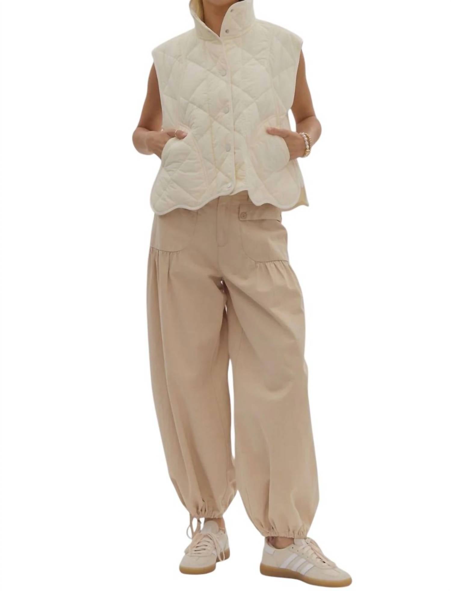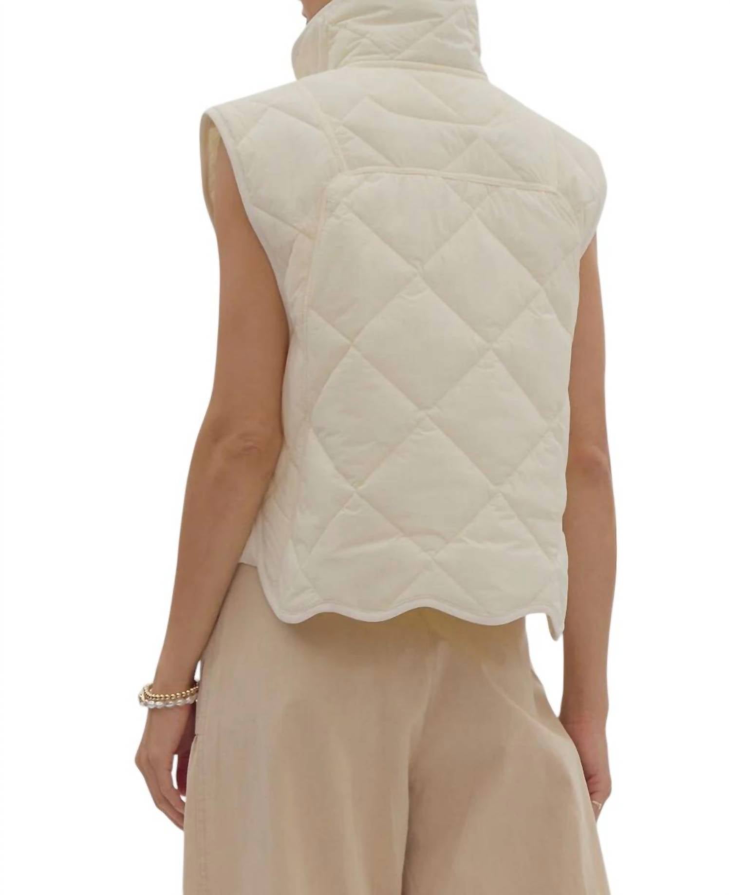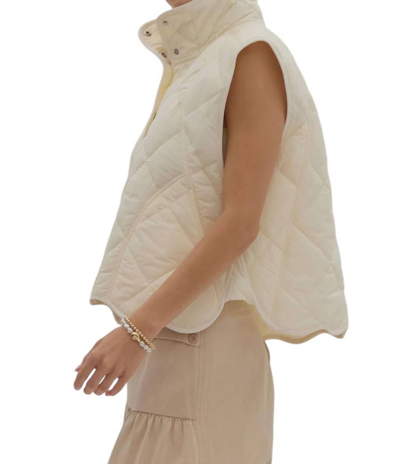 That extra layering piece you didn't know you needed! This sleeveless vest is crafted from 100% Nylon, ensuring a lightweight feel without compromising on style. Designed with a practical snap closure and convenient side pockets, it features a charming scalloped hem for a touch of flair. The color and unlined, non-sheer woven construction make it the perfect addition over a fitted long sleeve top.