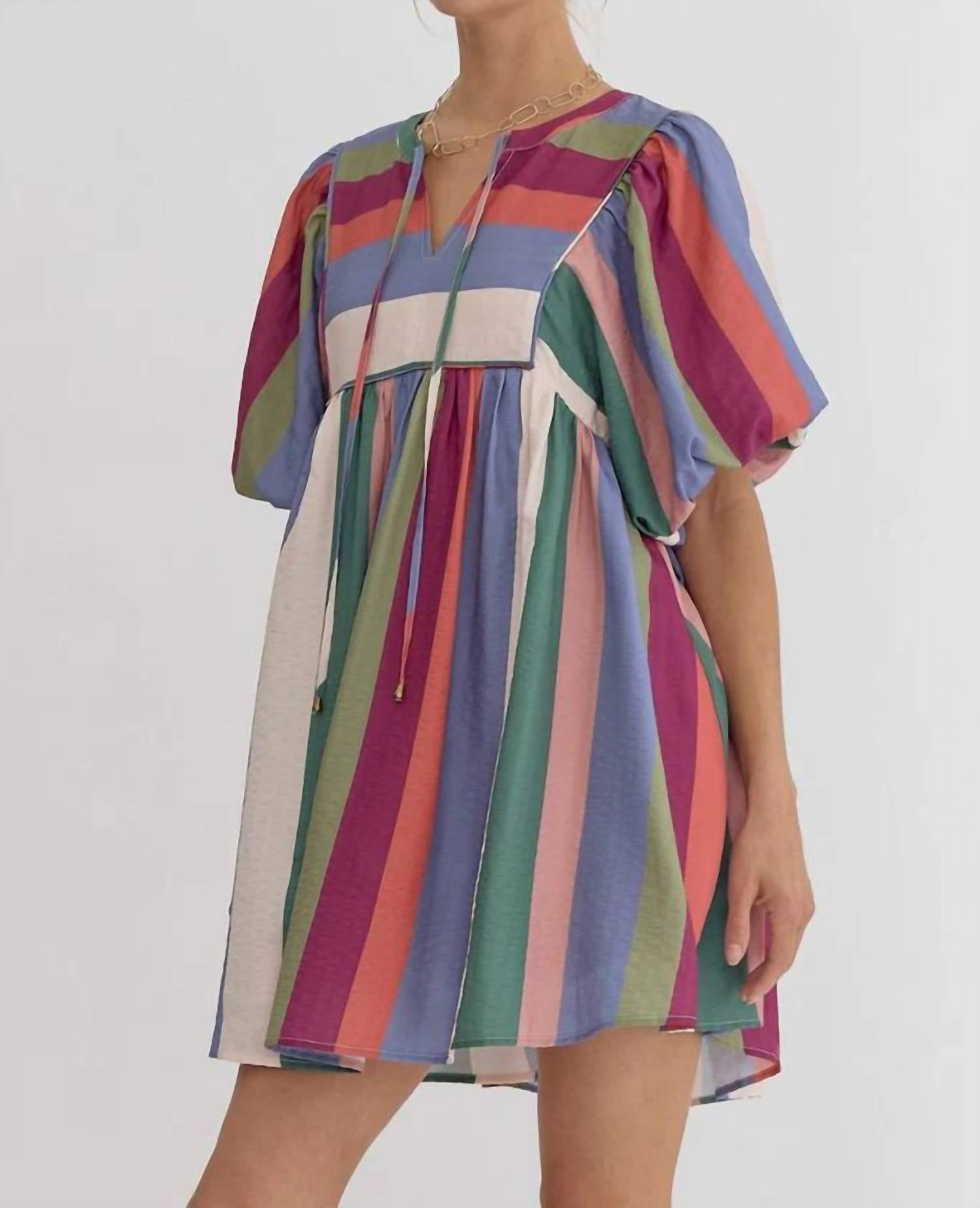 Playful and vibrant addition to your wardrobe. Delightful mini dress features short bubble sleeves and a chic self-tie V-neck. Crafted from lightweight, non-sheer woven fabric. Multicolor stripe pattern offers a splash of color. Designed in a shift silhouette with elastic cuffs for comfort. Simply pulls on for effortless wear.