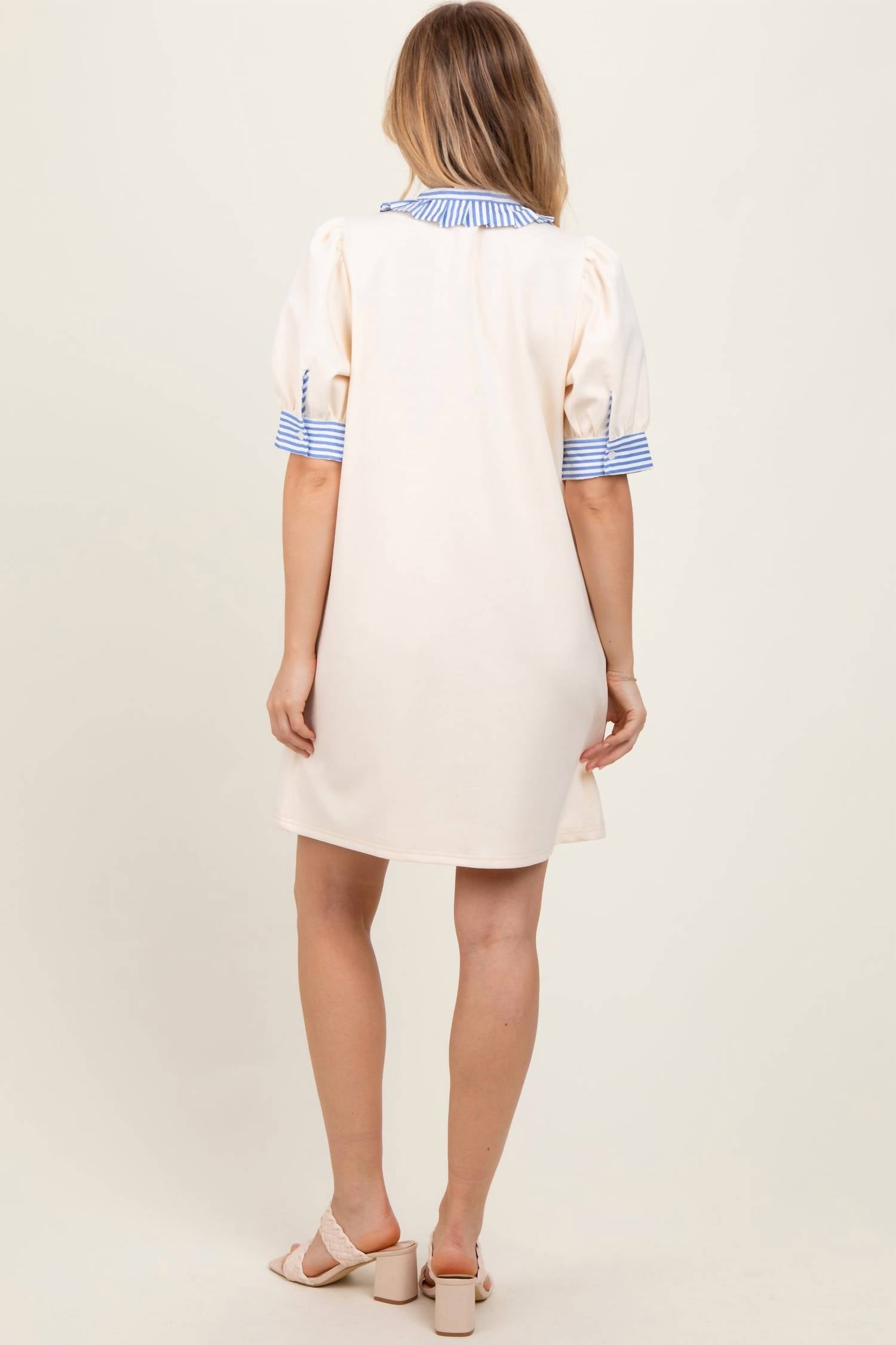 A short and breezy dress for those warmer days. Elevate your wardrobe with the Entro Striped Collar Shirt Dress, featuring short sleeves in a chic cream color with blue and white stripes. Crafted from a cotton blend (50% cotton, 43% polyester, 7% spandex), this mini-length dress offers all-day comfort and a polished look with its structured collar and button closure. Perfect for various occasions, it also includes practical pockets. Care for this effortlessly chic piece by hand washing it cold, line drying, and using a low iron if needed.