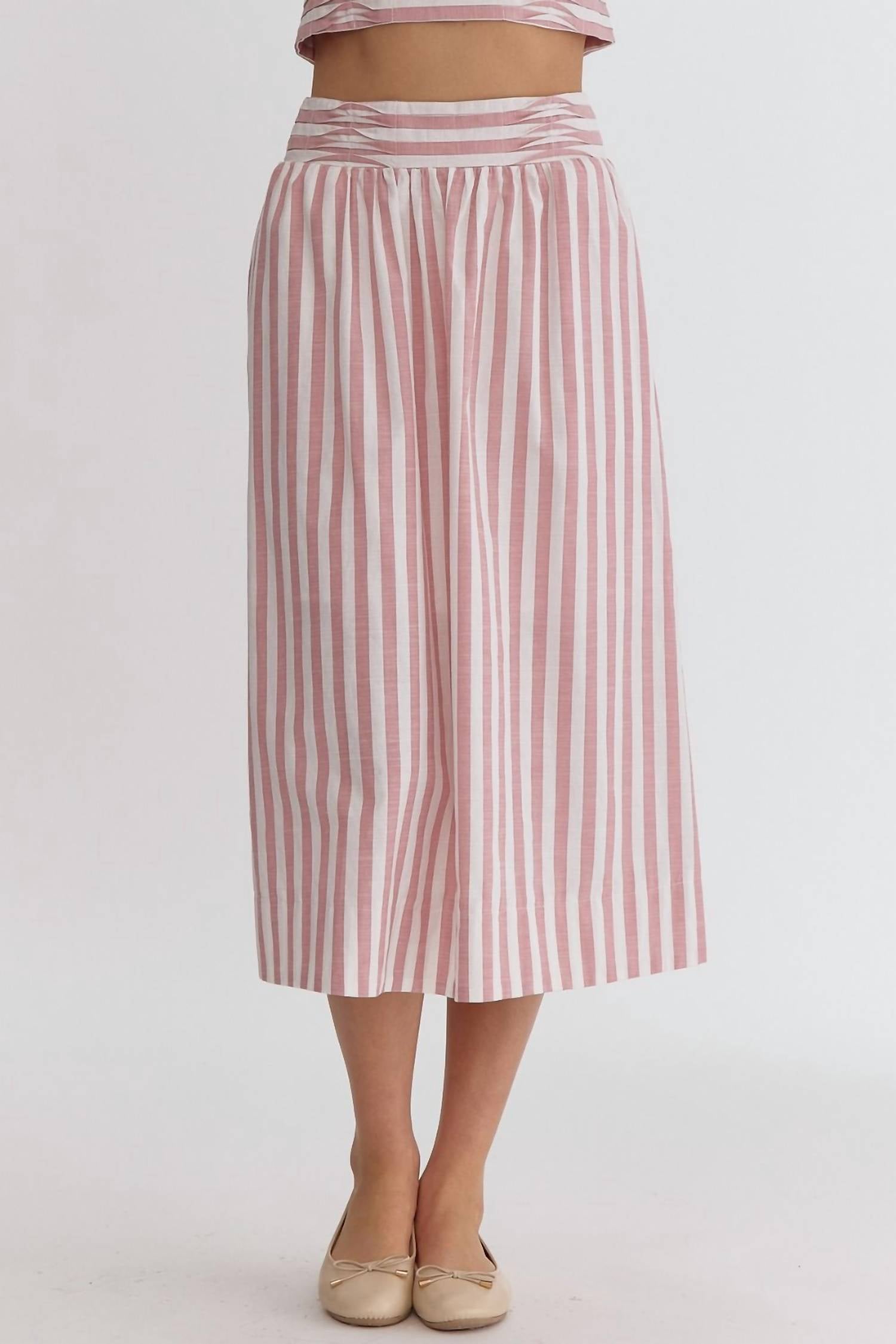 Show off just the right amount of skin in this beautifuly designed midi length skirt.Striped midi skirt featuring smocking at waistband. Pockets at side, lined, woven, non-sheer. Lightweight.