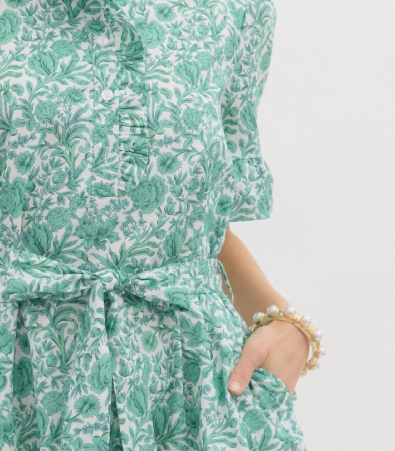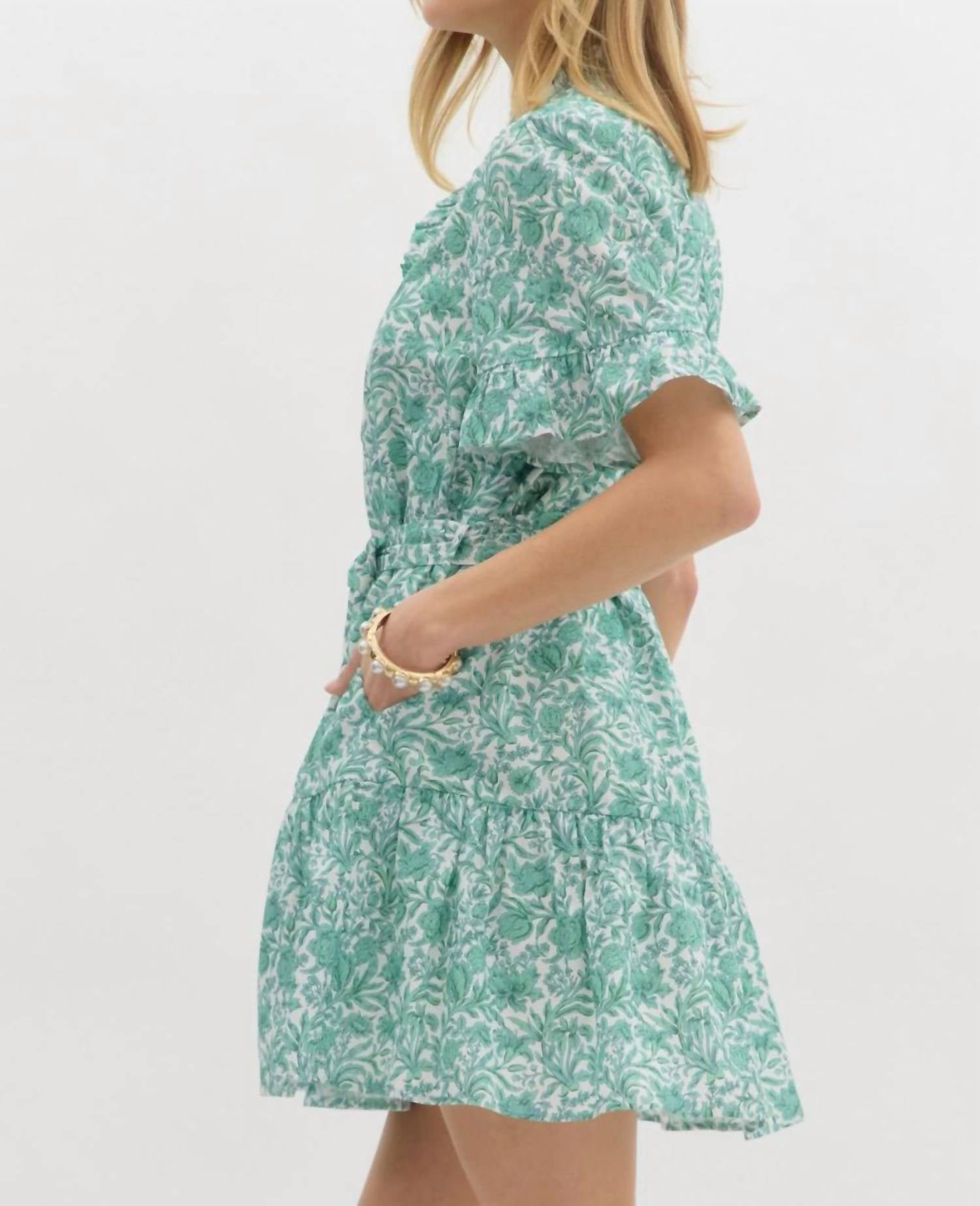The perfect mini dress for those warmer months. Add a touch of boho chic to your wardrobe with the Sweet Finish Floral Print Dress by Entro, perfect for summer vacations or Thanksgiving get-togethers. This green mini dress boasts a vibrant floral pattern, adorned with short ruffled sleeves and a stylish ruffle trim. Made from 100% Cotton, the dress features a convenient button closure and includes a removable belt sash for versatile styling. Ideal for women looking to embrace a feminine and carefree look.