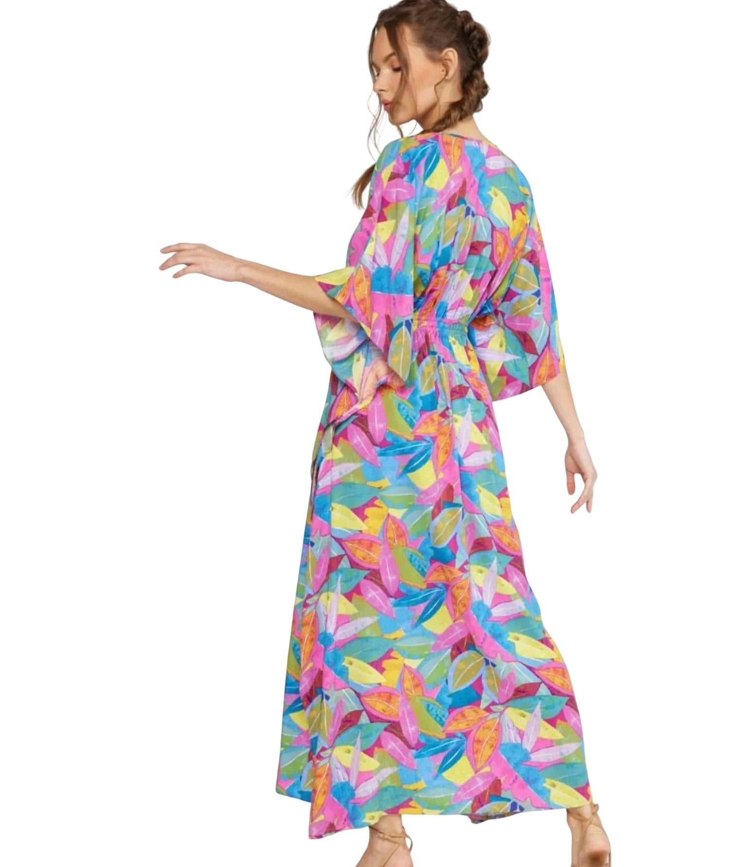 A maxi dress that is just as cute as it is comfortable. Introducing the Tropical Print Maxi Dress by Entro, a perfect vacation piece in a vibrant Blue Multi pattern. This A-line dress features a v-neck and three-quarter sleeves, with a tassel tie drawstring at the waist for a flattering fit. Crafted from soft rayon fabric, it offers a breezy and comfortable feel. Closure: Pull on. Care instructions: Hand wash and line dry.