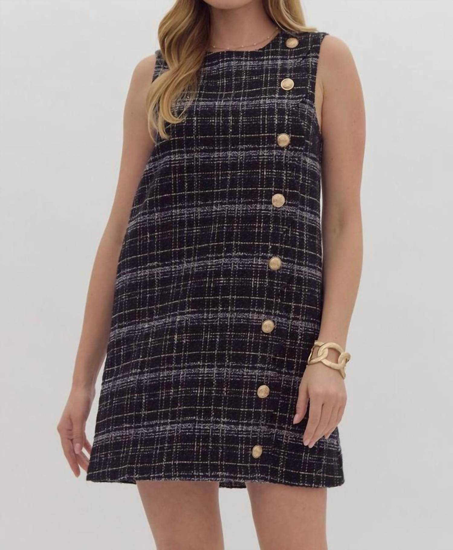The perfect mini dress for those warmer months. Introducing the Tweed Sleeveless Mini Dress by Entro, an elegant dress with a faux button detail that enhances its fashion-forward appeal. This mini dress is crafted from 100% polyester for lightweight feel and features a convenient zip closure at the back.