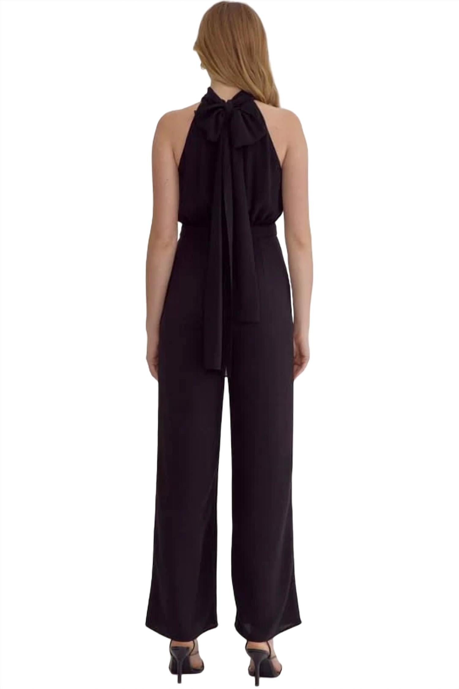 It doesn't take much for this one piece to look effortlessly cool. Add some statement jewelry to dress it up, or throw on some sneakers for a more casual vibe.This solid halter neck jumpsuit features a sleeveless design with a multiway self-tie at the neck, and a zipper and button closure at the back. It is lined, woven, non-sheer, and lightweight. Made from 100% polyester. The model is 5'10" and wears a size Small.