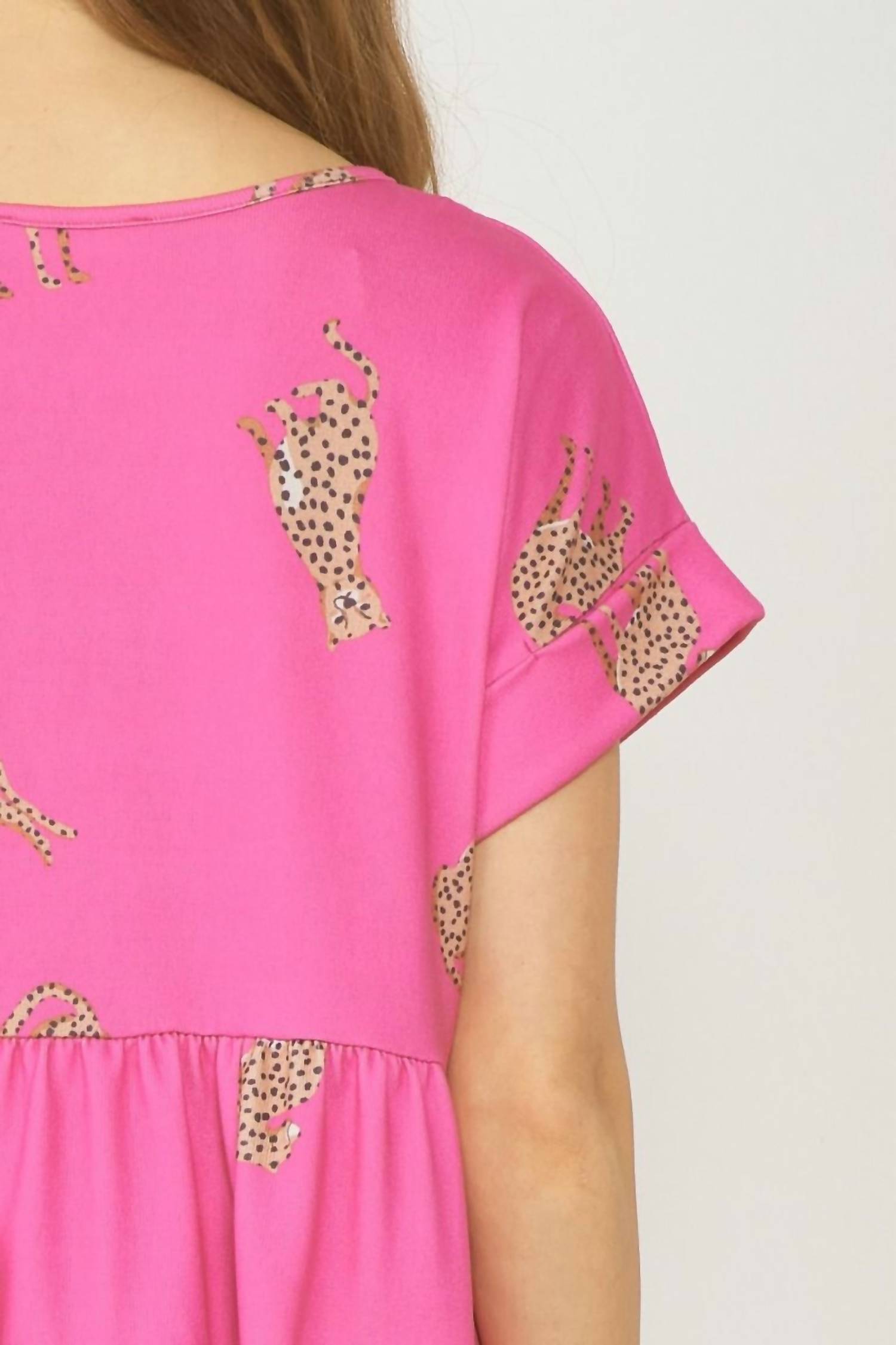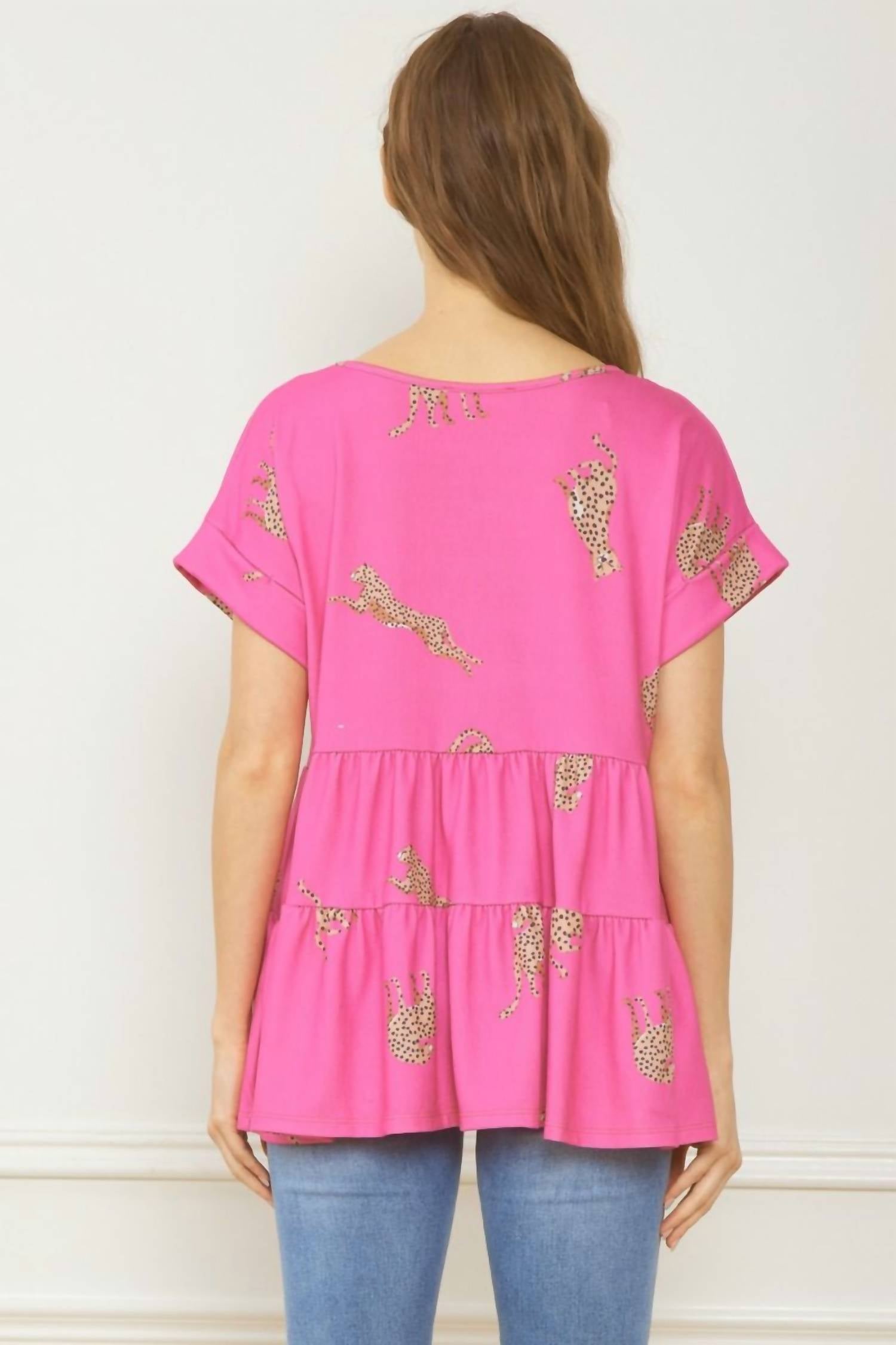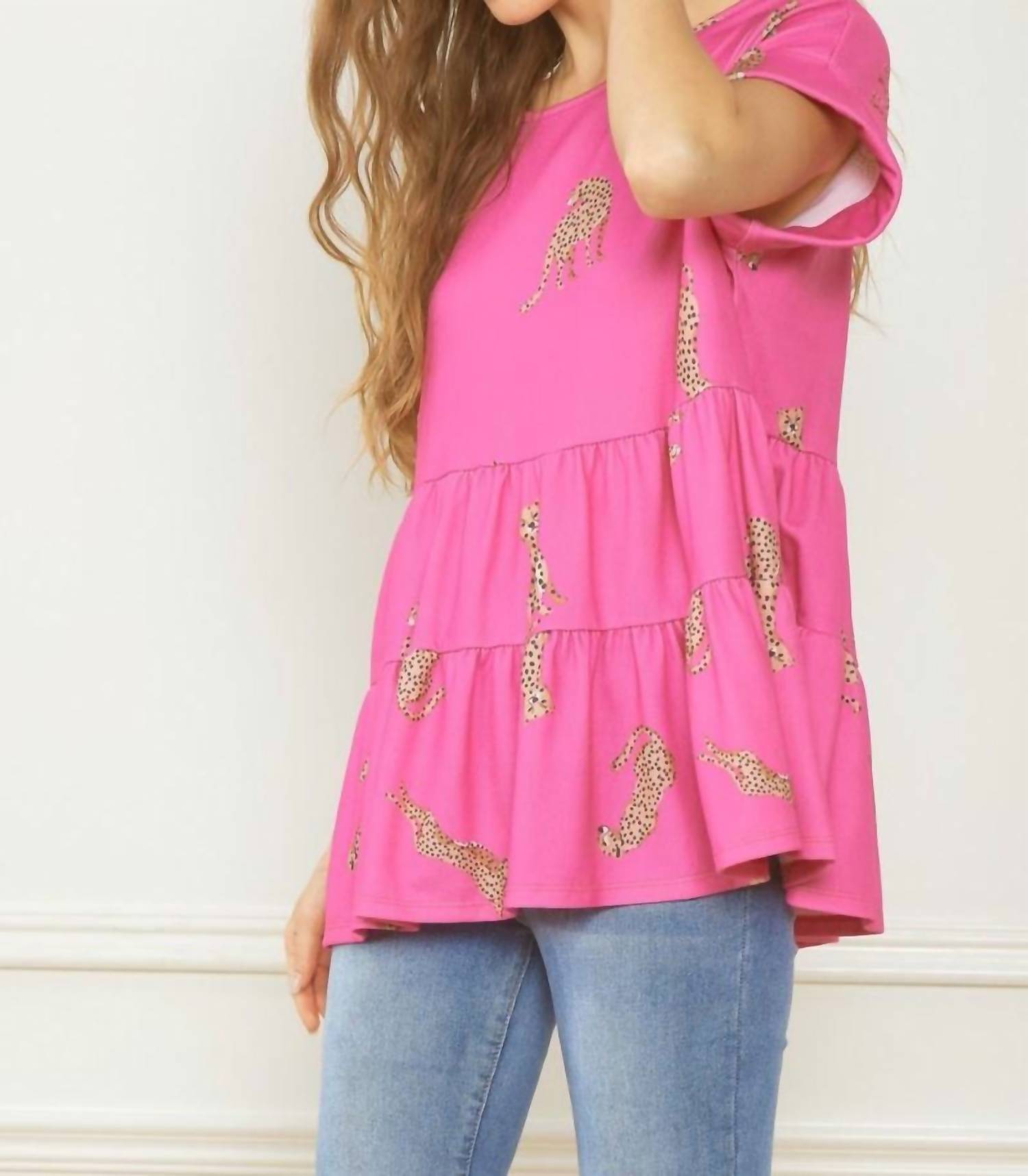 A versatile blouse that works from desk to dinner!Round neck short sleeve tiered top featuring permanent rolled cuffs. Unlined. Knit. Non-sheer. Lightweight. The Ella Top is the summer version of the oh so popular WILD CAT SWEATER! She is a print hot pink tiered top with some frolicking leopards! She as a round neck with permanent rolled cuffs on the short sleeve. Her polyester and spandex blend makes her soft that she feels like a bath towel!