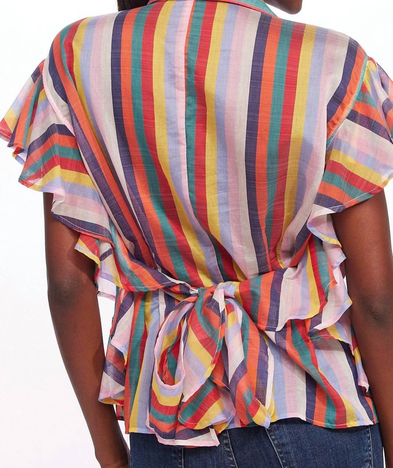Pair this with your favorite jeans and slides for your next girls night out. Elevate your holiday party look with the Berenice Top by EVA FRANCO, featuring a vibrant Fiesta Stripe pattern. This breezy blouse is crafted from cotton and adorned with a collared neck, cap sleeves, and ruffled cuffs for a festive flair. With a convenient button closure and ties at the back, this top is proudly made in the USA. Ideal for spring gatherings, the Berenice Top combines comfort and style effortlessly.