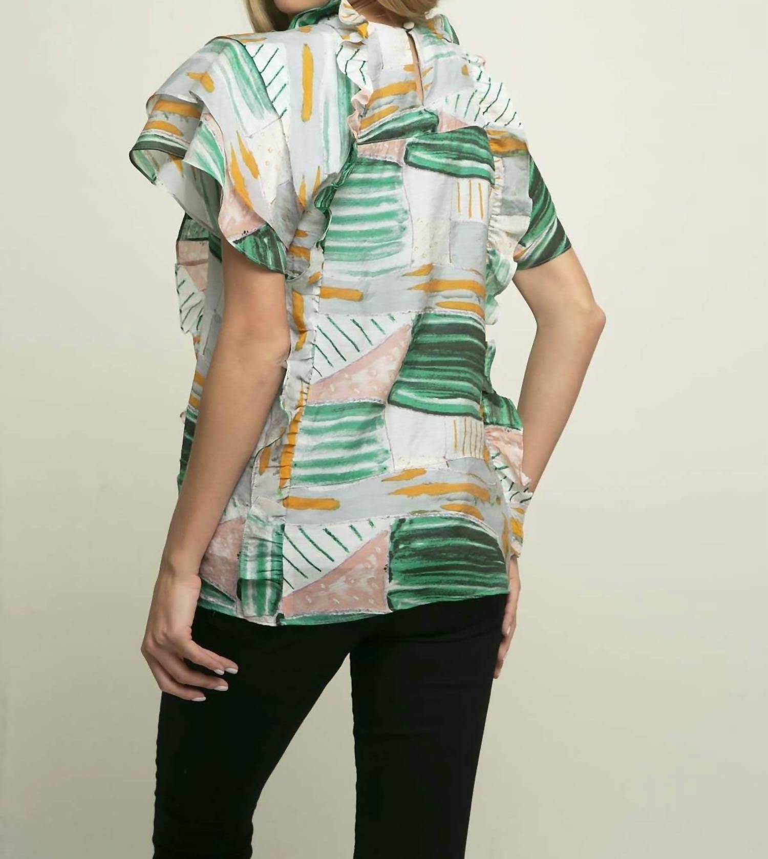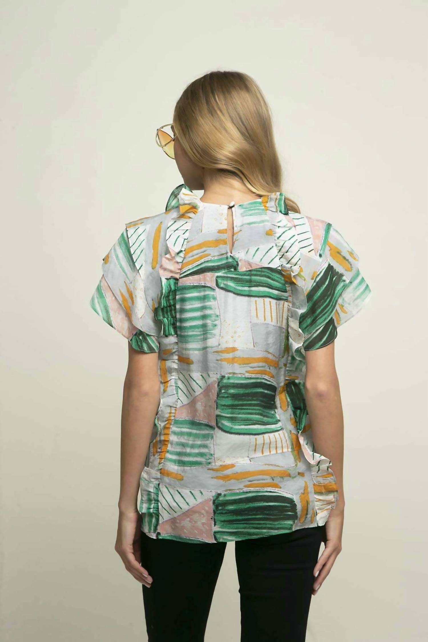 Discover the Zoe Top by EVA FRANCO, a stunning piece that embodies boho chic style with its layered angel short sleeves and vibrant Rum Baba abstract print. Crafted from 85% Rayon and 15% Acrylic, this blouse boasts enchanting rows of ruffles and is made with care in Los Angeles, USA. It features a button and loop closure at the nape for a charming finish. Ideal for travel and St. Patrick's Day celebrations, this eye-catching top requires hand washing for optimal care.
