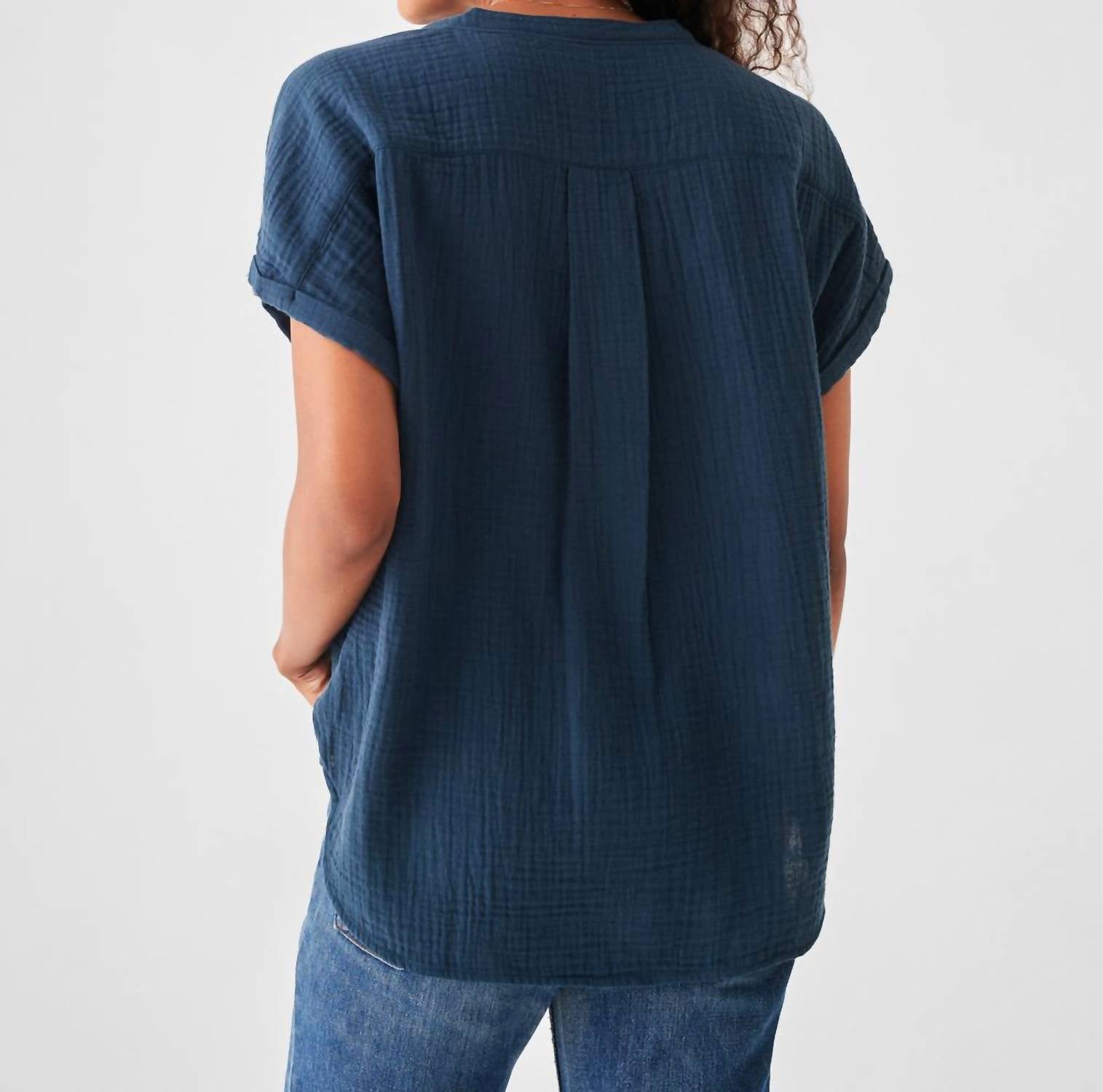 A versatile blouse that works from desk to dinner! Embrace effortless style with the Faherty Dream Cotton Gauze Desmond Top in navy blue, crafted from 100% organic cotton for a breezy feel. This short sleeve blouse features a relaxed silhouette with a band collar, dolman sleeves, and triangle gusset at the side seam hem. The natural 2-hole real Agoya shell button closure adds a touch of elegance. For care, turn inside out, machine wash cold on a gentle cycle, and lay flat or hang to dry.