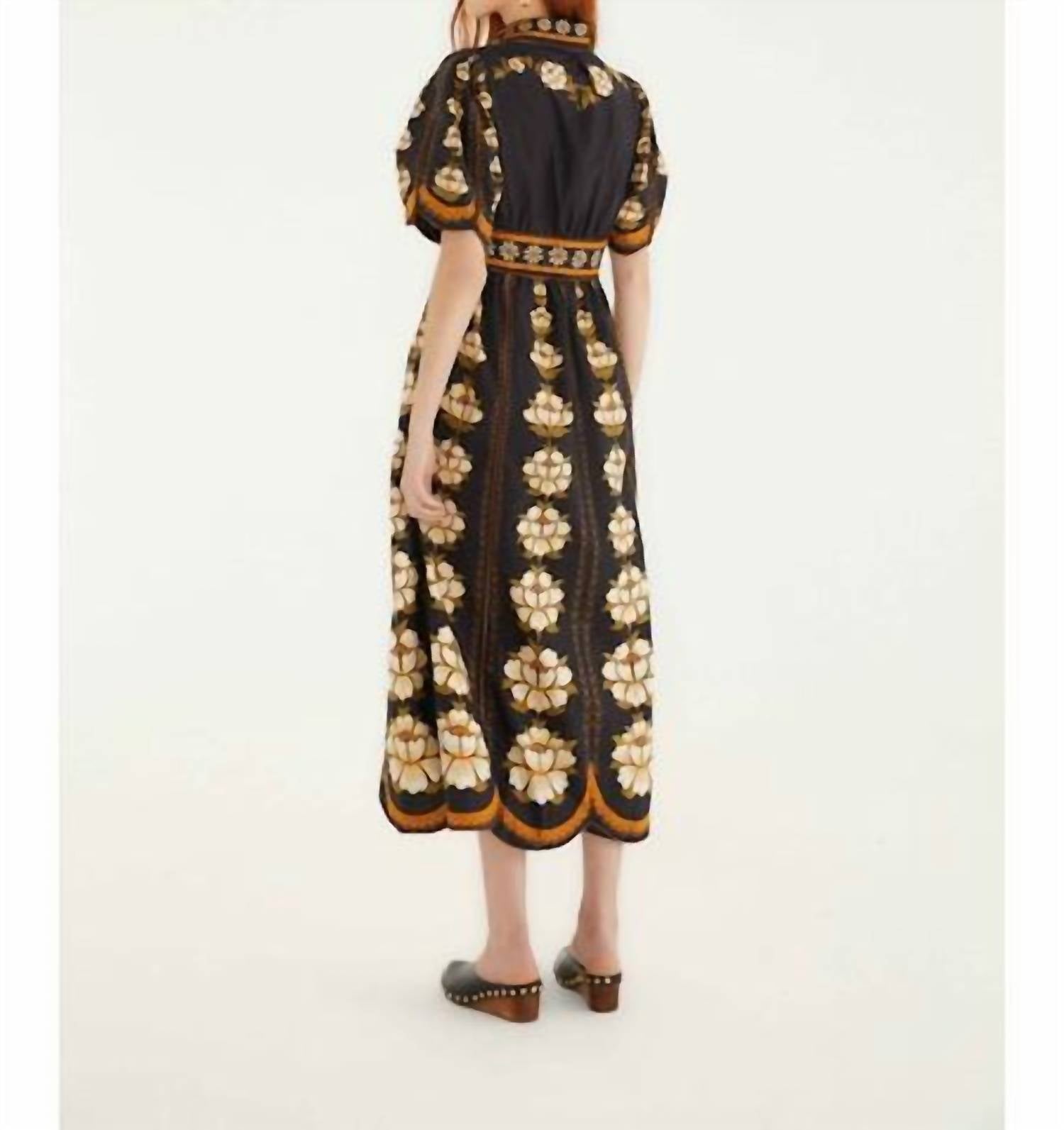 Just add slides or mules and you are good to go. Introducing the Bold Flowers Organic Cotton Midi Dress by FARM Rio, a stunning addition to your wardrobe crafted from 100% certified organic cotton. This A-line cut dress features short sleeves and a vibrant floral pattern against a rich black backdrop, perfect for Spring occasions. A structured V-neckline and an invisible zipper at the side seam add to its boho chic elegance, while the scalloped hemline offers a whimsical touch. Care for this eco-conscious piece with a gentle hand wash.