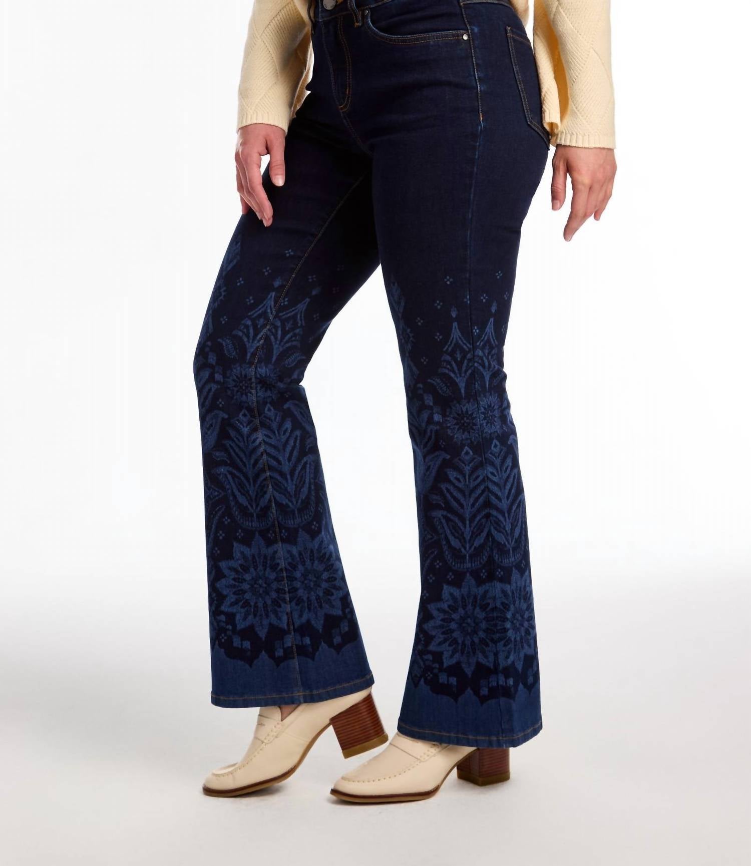 Just as cute as they are comfortable. Introducing the FDJ Olivia Artist's Print Flare Leg Jean in Dark Wash, designed to make a statement with a graphic border print by a local artist. These mid-rise jeans feature a relaxed fit and flared leg for a 90s fashion vibe, complete with functional pockets and a secure button closure. Composition: 66% Cotton, 30% Polyester, 3% Viscose, 1% Elastane. Inseam measures 30 inches for the perfect length. Care: Machine wash and tumble dry for easy maintenance—ideal for spring outings.