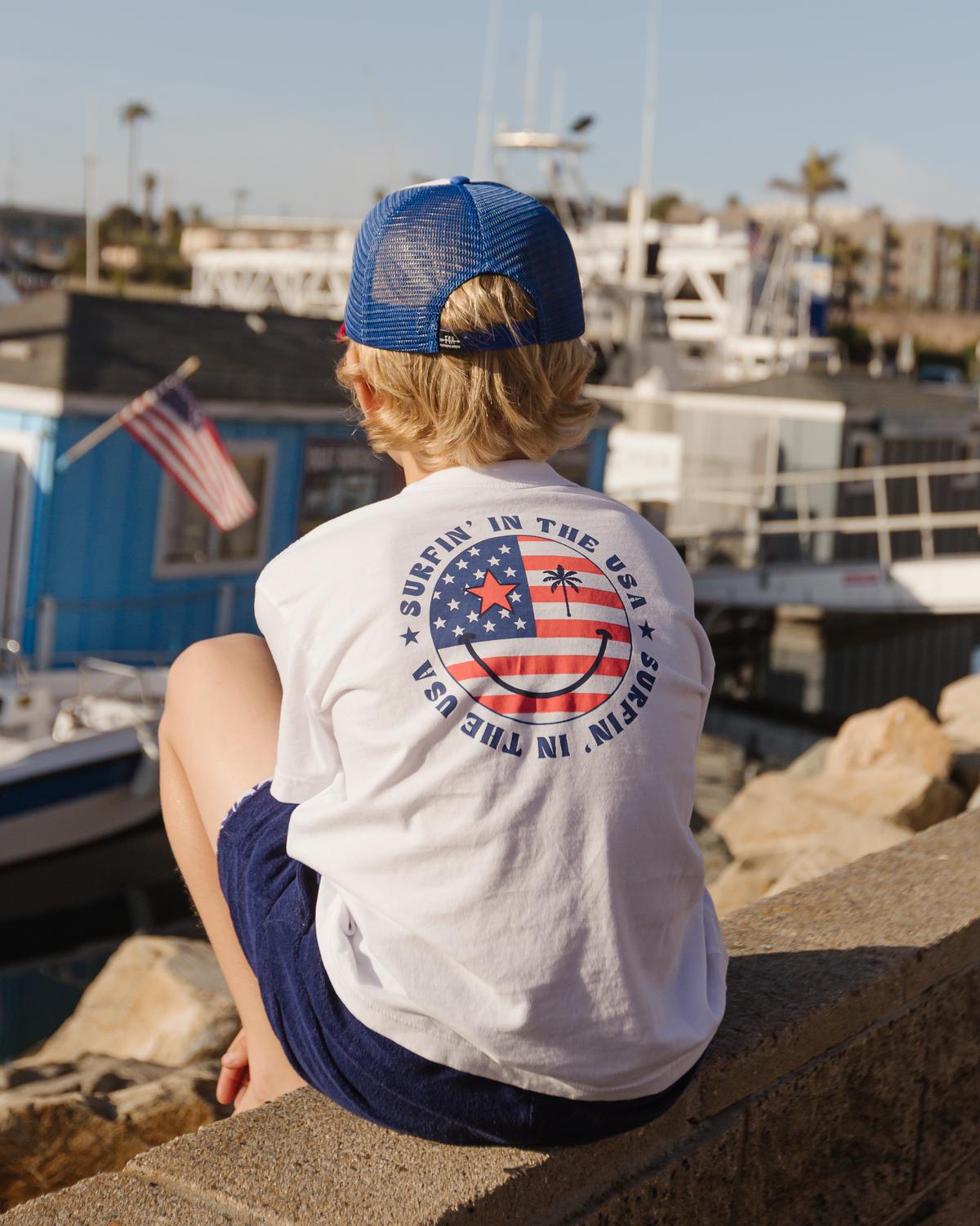 Introducing the Surfin' Vintage Tee by Feather 4 Arrow, crafted from 100% premium cotton for ultimate softness and durability. This short sleeve tee features a crew neck and showcases a vibrant 'Surfin' USA' graphic on the back with a smiley graphic on the front left. Specially enzyme washed for a gentle hand feel, it is perfect for beach days or casual outings. Care is effortless with machine wash cold inside out and tumble dry low.