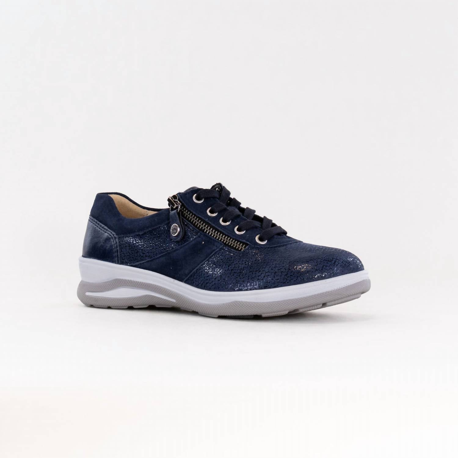 Get your daily steps in with these adorable sneakers. Introducing the Women's Multistretch Mitzy Shoes by Fidelio, designed in a chic Denim Kombi color for a minimalist touch this spring. These sneakers feature a flexible stretchable forefoot upper with seamless construction, offering a perfect fit for a full orthotic insert. Constructed from premium leather, they also boast a zipper and lace closure for added convenience. Equipped with a removable natural cork insole and air cushion polyurethane sole, these shoes ensure a comfortable stride and excellent grip. Ideal for a dinner party or holiday gatherings, they come in a medium width and a round toe for all-day comfort.