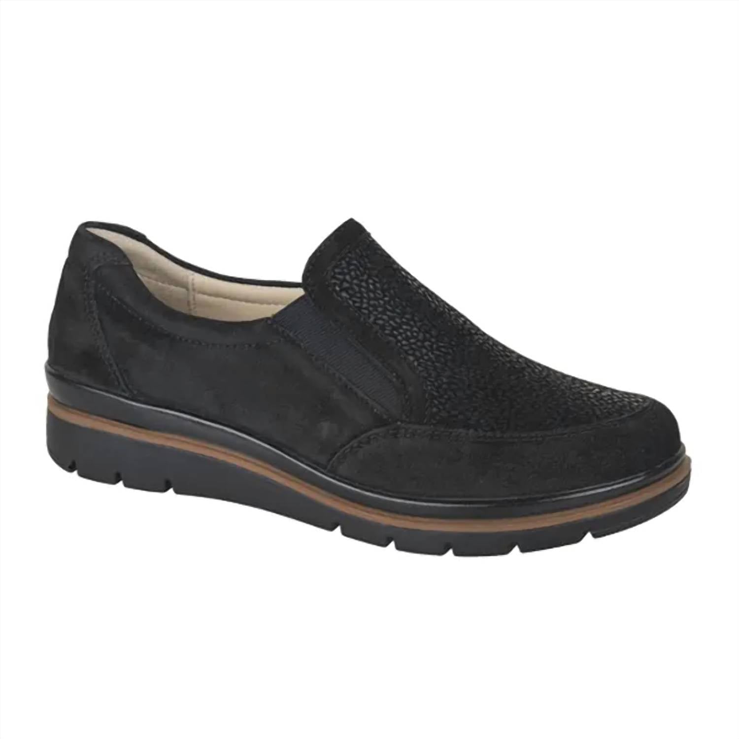 Loafers so versatile you can wear them with just about anything. Step into effortless style with the Women's Namir Flats by Fidelio, crafted from luxurious lamb and goat leather. These black nubuck/patent flats showcase a minimalist design perfect for summer vacations. Featuring a removable cork insole and an air-cushioned polyurethane sole, comfort is seamlessly blended with every step. Designed with a round toe and flat heel, these are vacation-ready essentials.