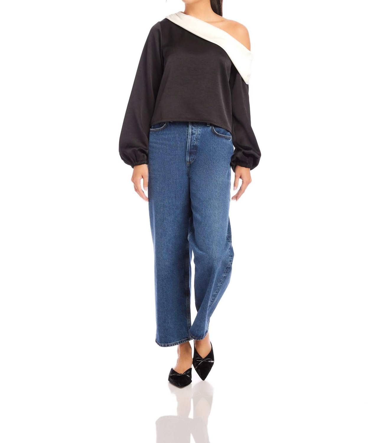 Elevate your evening look with the Marisa One-Shoulder Top by Fifteen Twenty, featuring long blouson sleeves and an off-the-shoulder neckline. The chic color block design in black and cream adds a sophisticated touch, crafted from 100% polyester satin for a luxurious feel. Measuring 20.5 inches in length (size S), this pullover is made in the USA from imported fabric. Care for this elegant piece by dry cleaning only and laying flat to dry.
