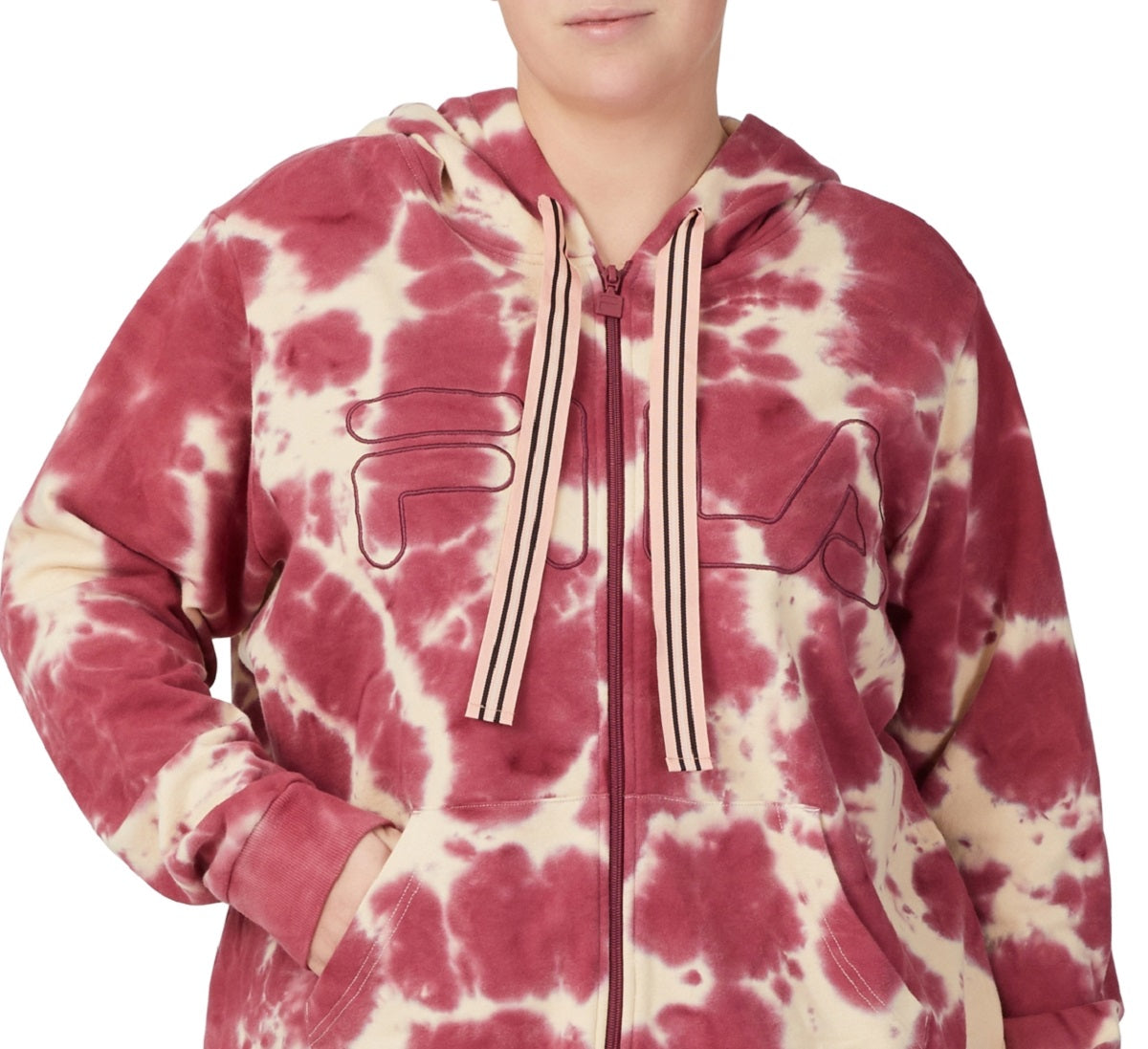 Fila refreshes your wardrobe and keeps you comfortably chic with the tie dye design on this plus size zip-up hoodie.| Relaxed fit; hits at waist; approx. 28-1/4 long| Attached hood with drawstring; zipper front closure| Kangaroo pocket on front| Cotton/polyester| Machine washable| Imported