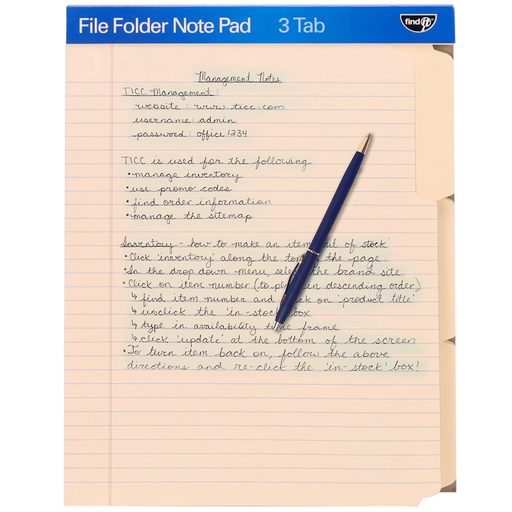 - WIDE RULED - The patented design of these notepad manila folders has changed the paper filing game forever. The wide-ruled pocket offers a place to keep your notes and documents in one place.
