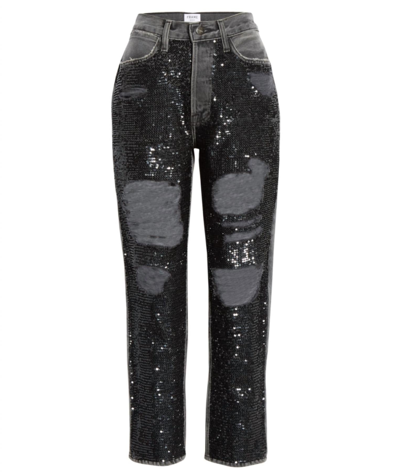 Pair these straight leg jeans with flats, sandals or even heels! You can't go wrong. Elevate your denim collection with the High-rise Sequined Straight-leg Jeans by FRAME, featuring a chic ankle-length design. Crafted from 100% cotton, these Basque Rips jeans are a blend of style and comfort, offering a shimmering sequin overlay at the front to add a touch of glamour. Made in the US, they feature a button closure for a secure fit and a mid-weight, non-stretch denim to maintain their silhouette. Care for these statement jeans with hand washing, ensuring their enduring appeal.