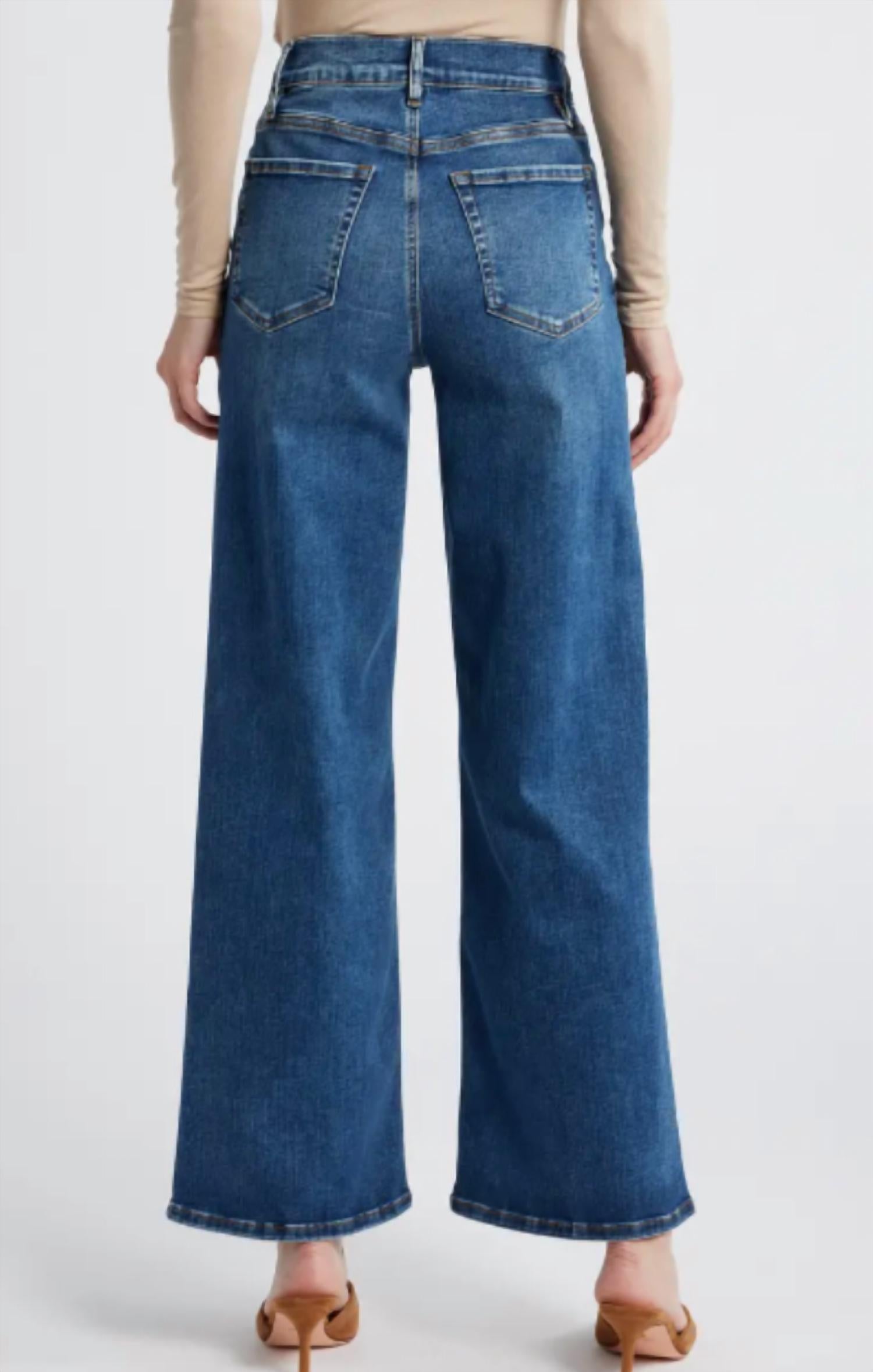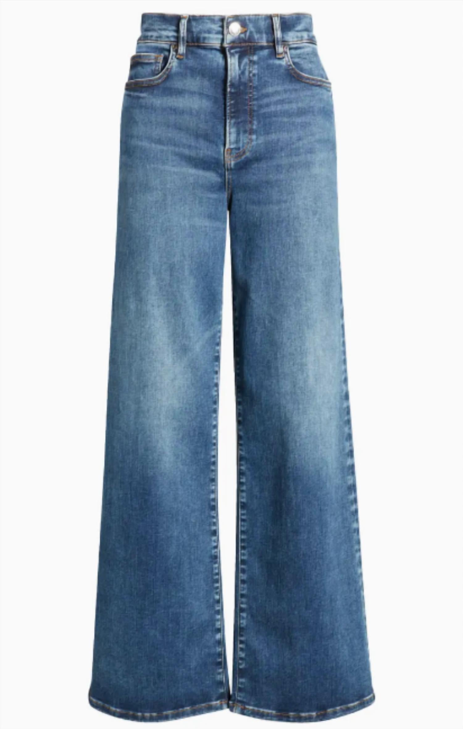 A flattering silhouette that's suprisingly versatile. Offer a timeless silhouette in a chic medium blue wash, perfect for elevating any outfit. Wide-leg jeans feature a high-rise waistline for a flattering fit and a zip fly closure for easy wear. Crafted from 63% organic cotton, 27% cotton, 5% recycled polyester, and 5% elastane. Provide slight stretch for ultimate comfort. With a 31" inseam, 23" leg opening, and 11.5" front rise. Machine wash and tumble dry for convenience.