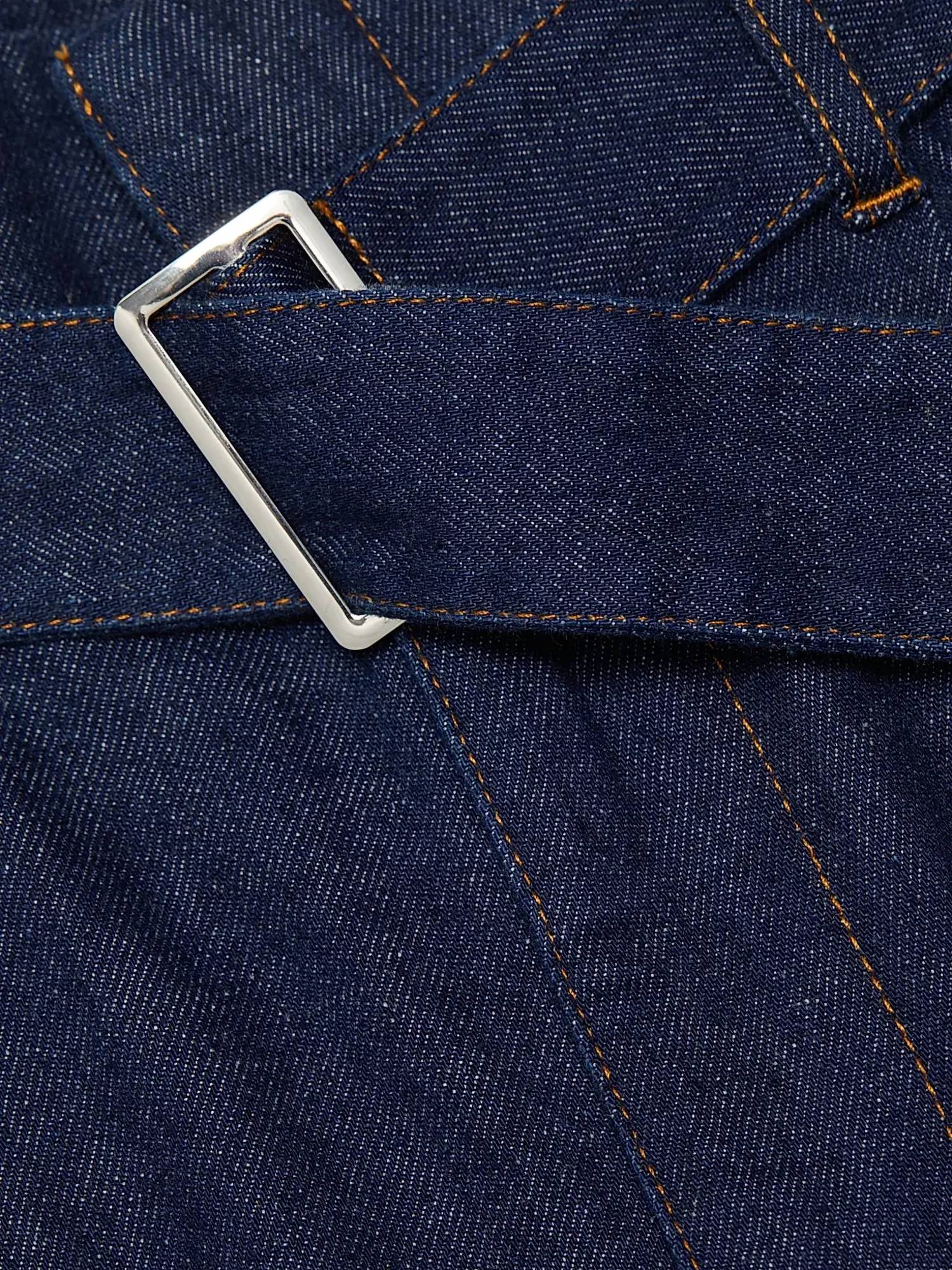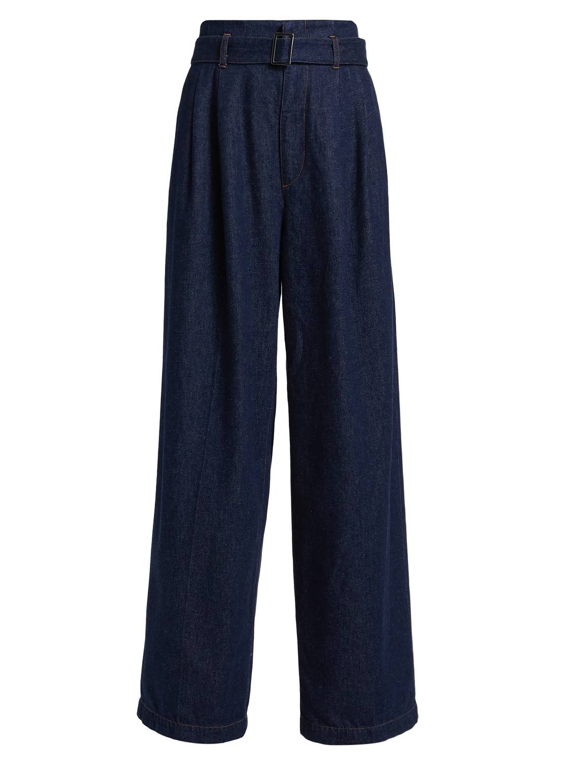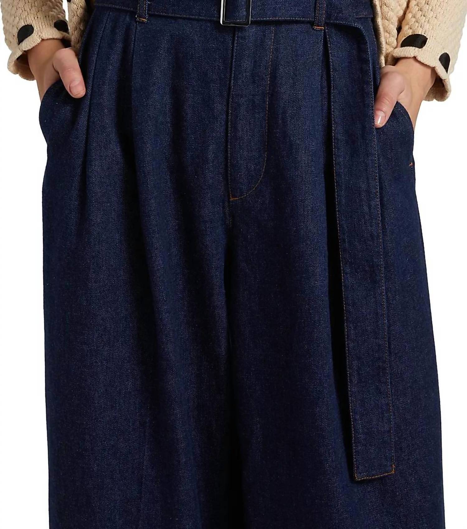 Embrace timeless fashion with FRAME's Paper Bag Denim Trousers in a sophisticated dark rinse. These trousers feature a zip closure, a D-ring self belt at the waist, and front pleat detail for added elegance. Made from a comfortable blend of 70% Cotton and 30% Lyocell, they offer a relaxed fit with a high rise of approximately 15.75" and an inseam of about 32", ending in a wide-leg silhouette with a leg opening of 15.75". Practical and stylish, the trousers include side slant pockets and back welt pockets, accentuated by contrast stitching and belt loops. Care is a breeze with machine wash instructions, perfect for long-lasting wear. Model is 5'10" and wearing a US size 4.