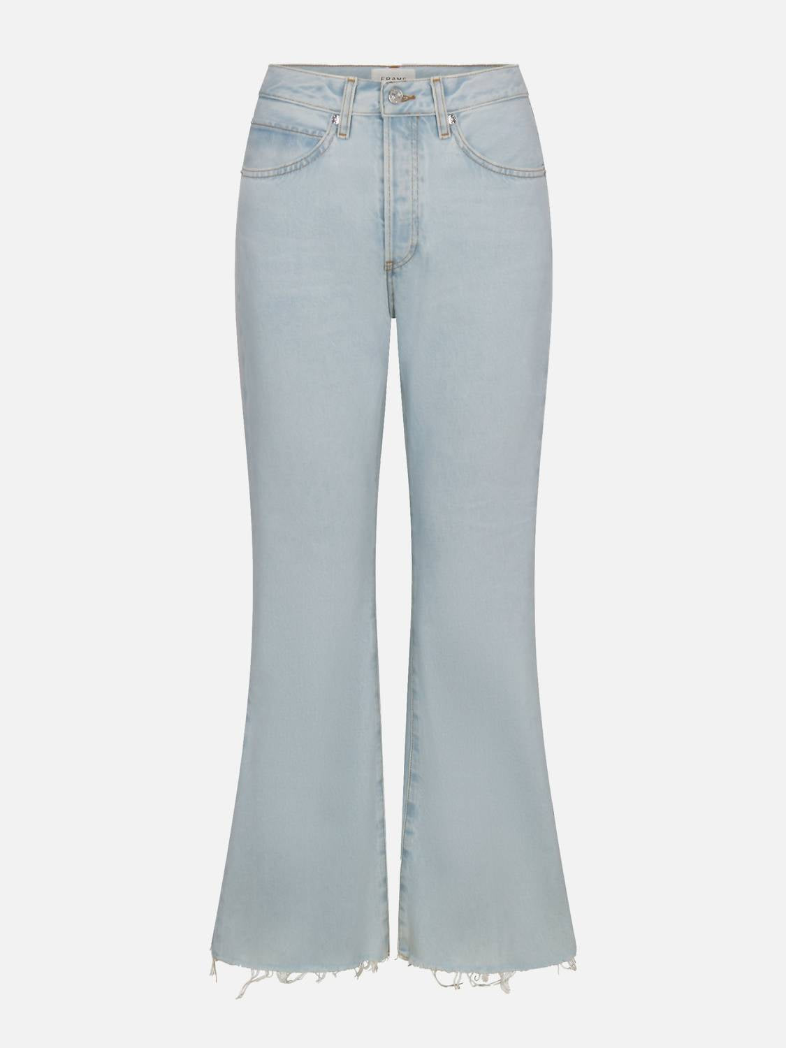 A flattering silhouette that's suprisingly versatile. Introducing the Women's The Lax Flare Pants by FRAME, a stylish choice in a Wisp Raw Fray shade perfect for your spring wardrobe. These pants feature a flared leg design with solid patterning, ideal for vacation and streetwear trends. Closure: Zip Closure. The light wash denim is perfect for a relaxed look, but the care instructions are not specified.