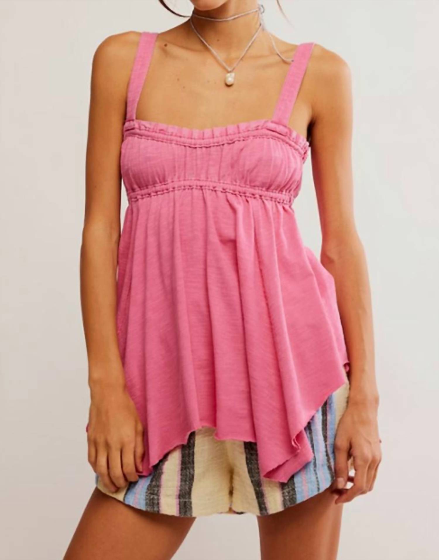 Discover the Amaryllis Tank Top by Free People, a must-have for any summer wardrobe in Ivory. This sleeveless tank is crafted from 100% airy cotton, featuring thick, fixed straps and a stylish square neckline accentuated by a ruched bust and ruffled trim. The longline design ends in a playful fairy hem, ensuring a flowy and feminine silhouette. Perfect for vacation or any Y2K-inspired outing, this top is easy to wear with its pull-on style and is conveniently machine washable.