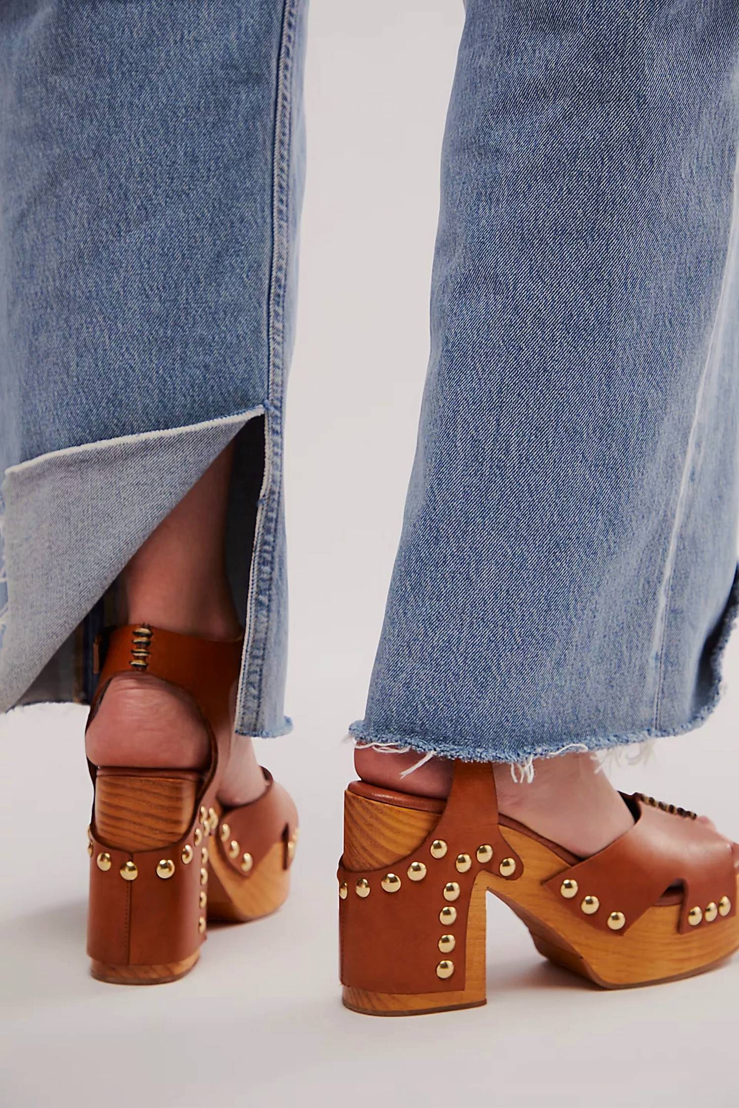 A trend that everyone is loving and this style might just be our favorite. Hand-touched detailing makes these mega-platform clogs extra special, featuring a responsibly-sourced wood sole and stud and seamed accents for a totally head-turning pair. Features: Slip-on style, leather uppers, open toe, center seam at toe strap, adjustable buckle ankle strap, pine wood platform sole, chunky block heel, lined footbed, dome stud accents