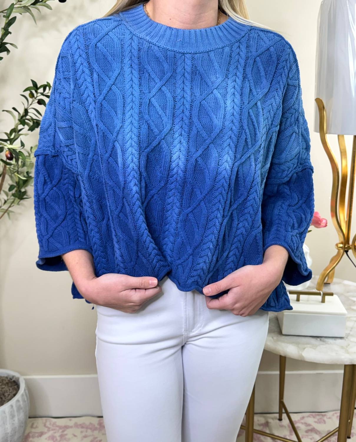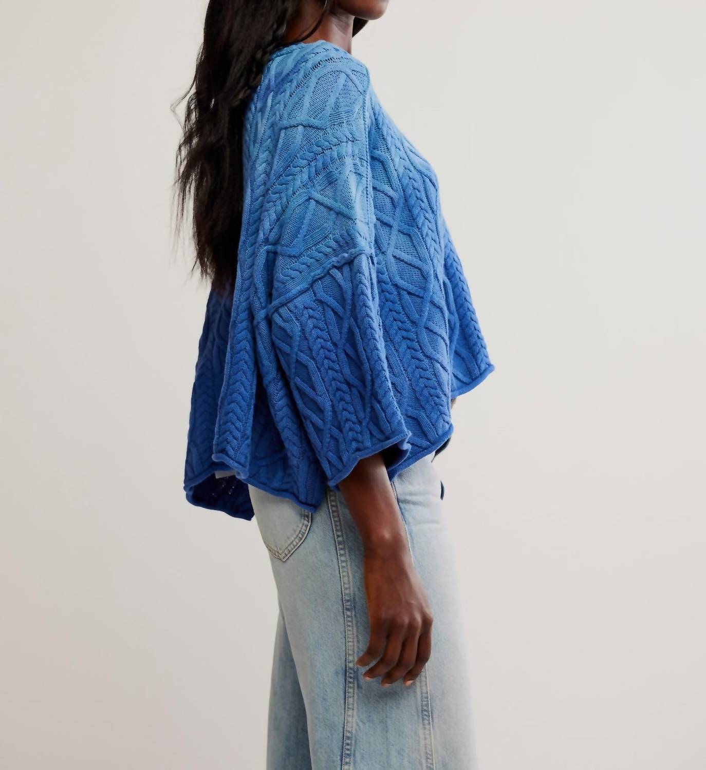 Wear this v-neck sweater with your favorite denim for the perfect fall look. Embrace ultimate comfort with the Washed Ashore Sweater by Free People, available in a charming Bellweather Blue. This women's oversized sweater features long, dropped shoulder sleeves and a classic cable knit design with a unique asymmetrical hemline. Composition: Textured fabric. Closure: Pull-on style. Country of Origin: Imported. Care: Hand wash cold and lay flat to dry. Measurements for size small include a bust of 64 inches, length of 19.5 inches, and sleeve length of 9 inches.
