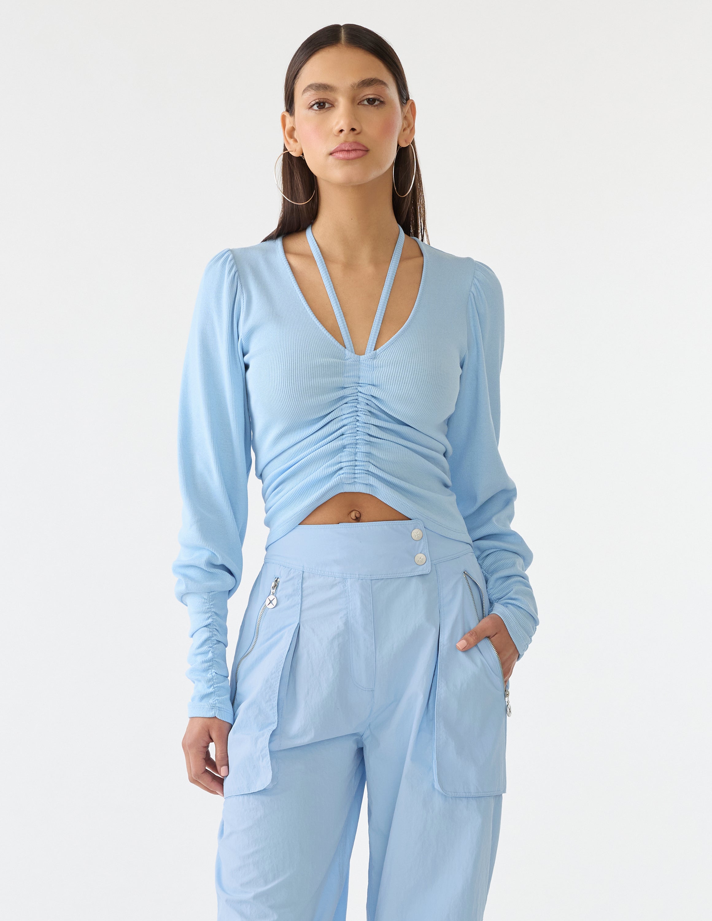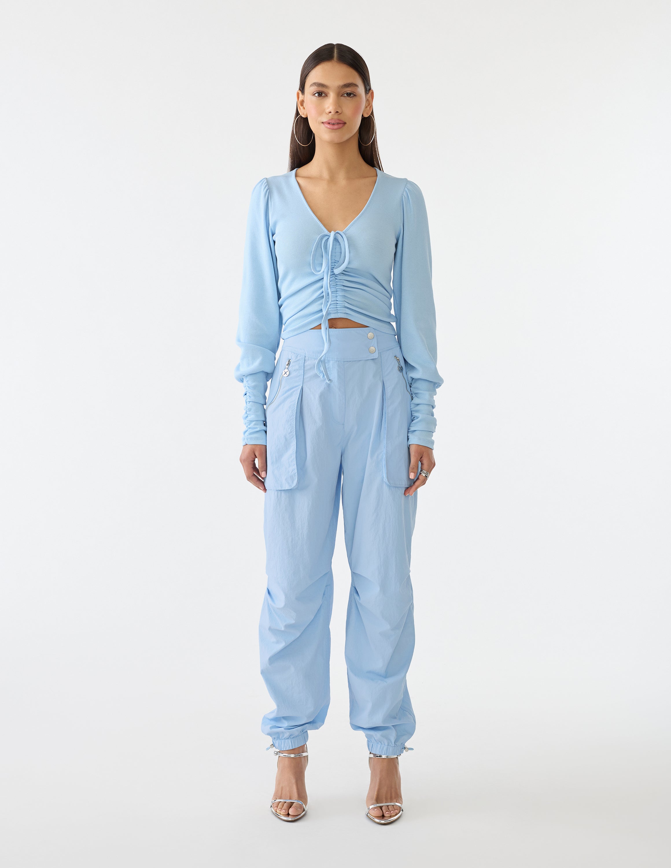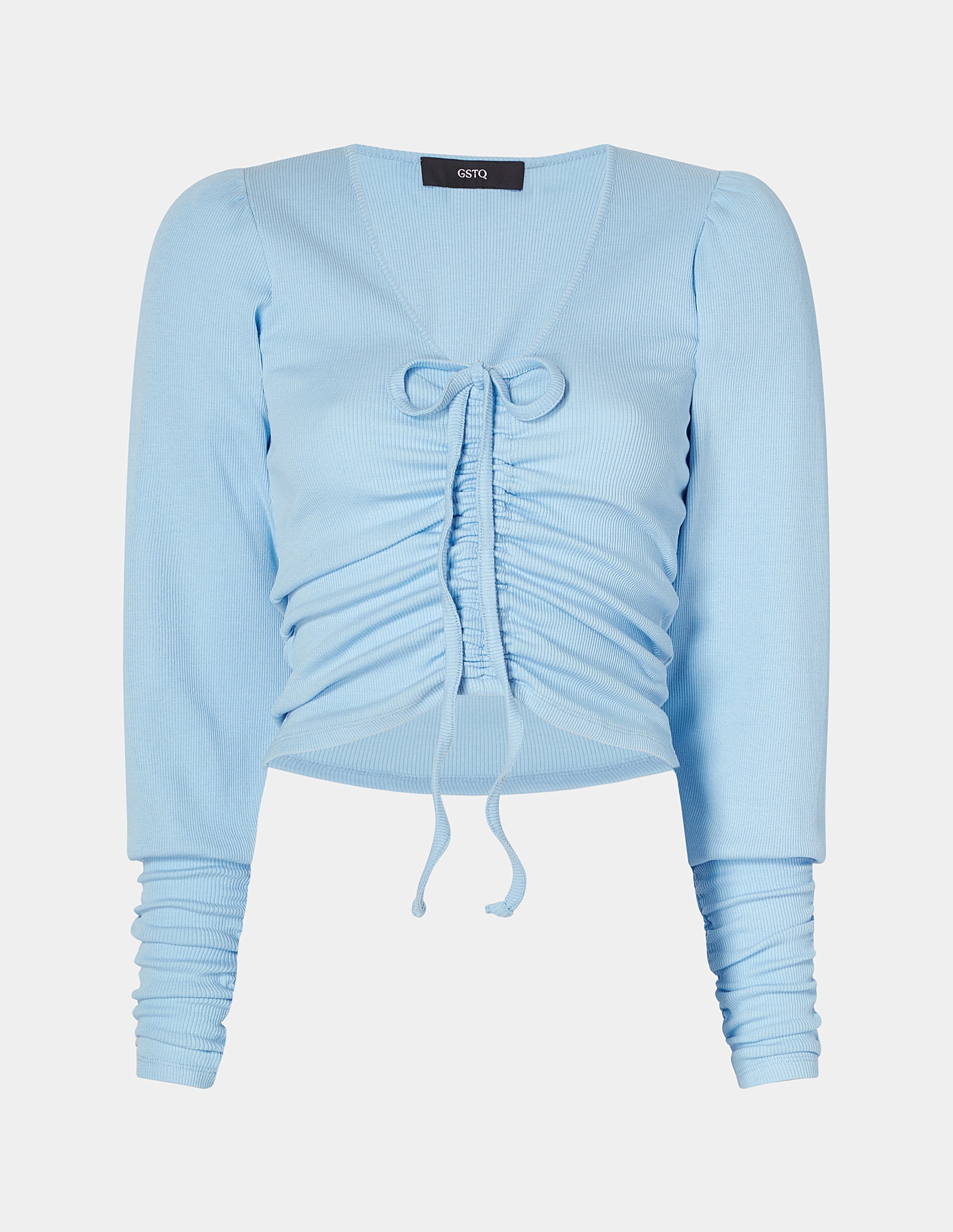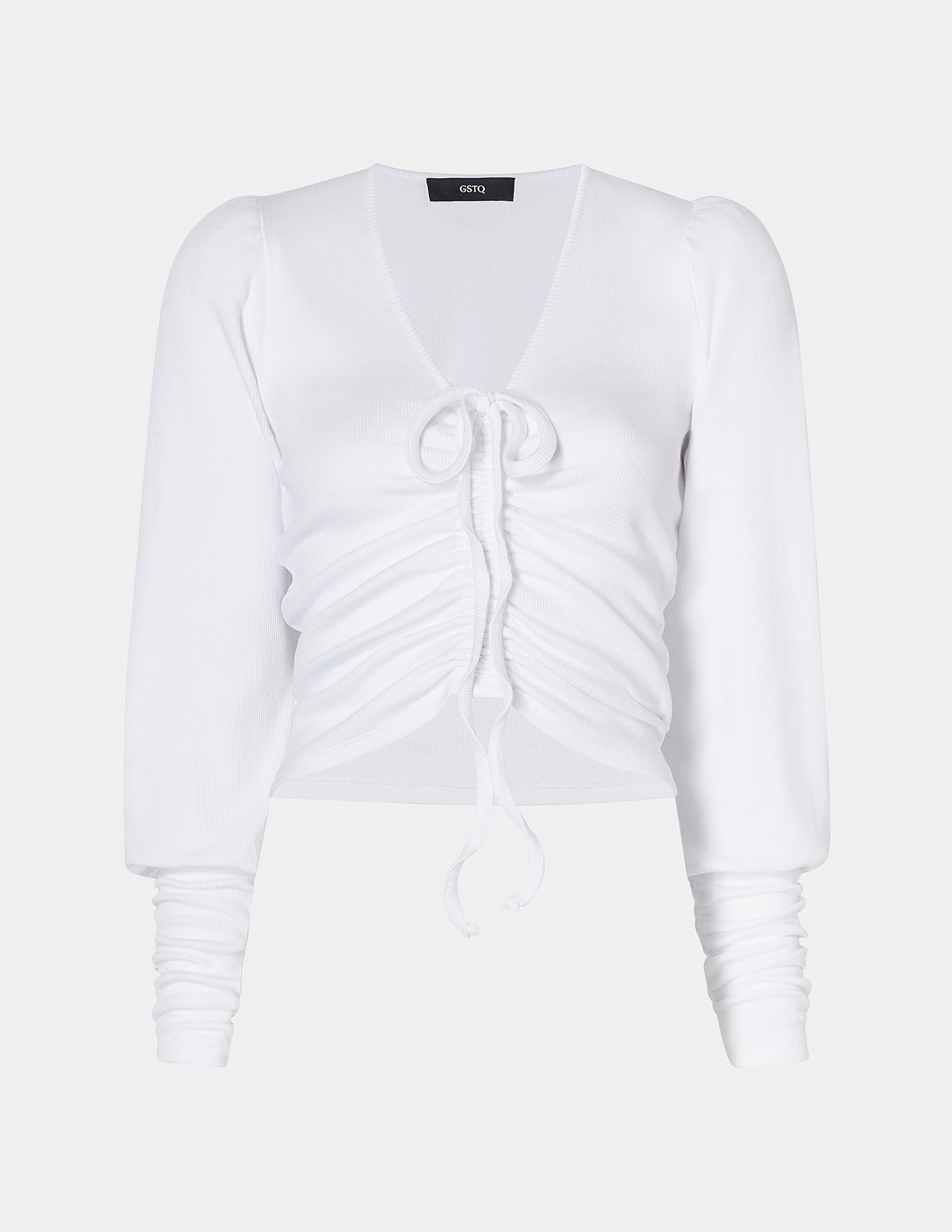Drawstring Long Sleeve is effortlessly chic with a customizable touch. Crafted with luxurious fabric, this top features front drawstring detail and long puffed sleeves, adding modern versatility to your wardrobe essentials.