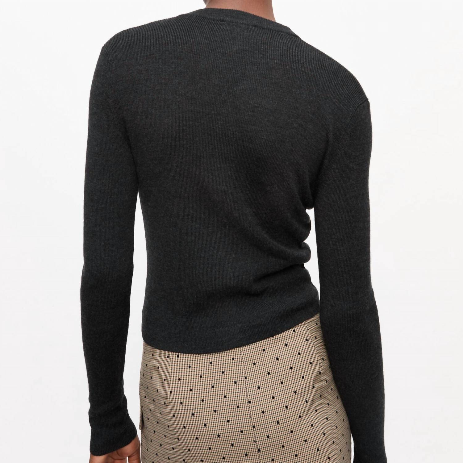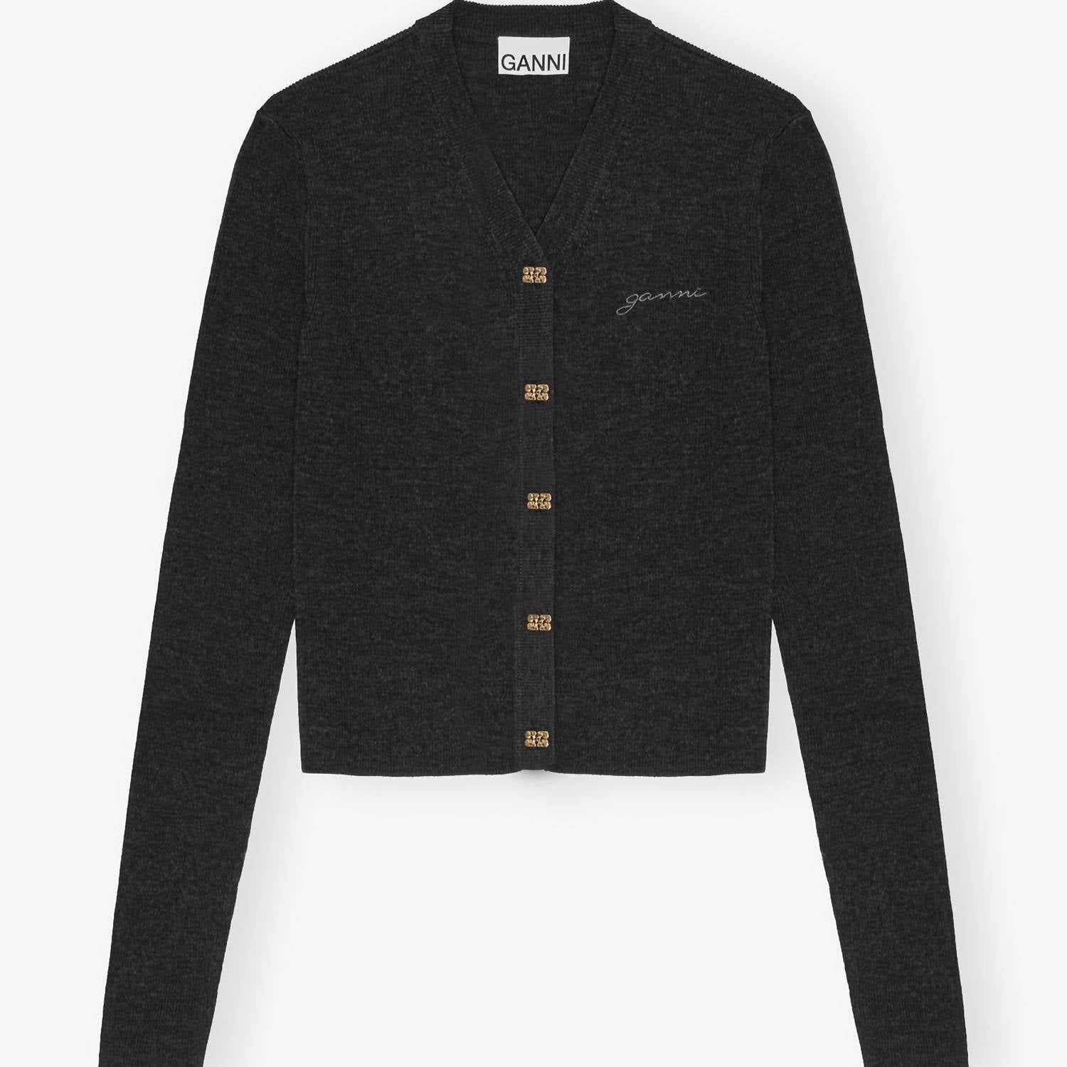 A classic fit that works just as good buttoned as it does left open. Elevate your wardrobe with the Mini Ribbed Merino Cardigan by GANNI, ideal for women seeking refined style. Crafted from 100% merino wool, this elegant cardigan features long sleeves, a v-neckline, and a classic button closure. The standout embroidered GANNI logo adds a touch of luxury to the Phantom-colored piece. Perfect for adding sophistication to any outfit.