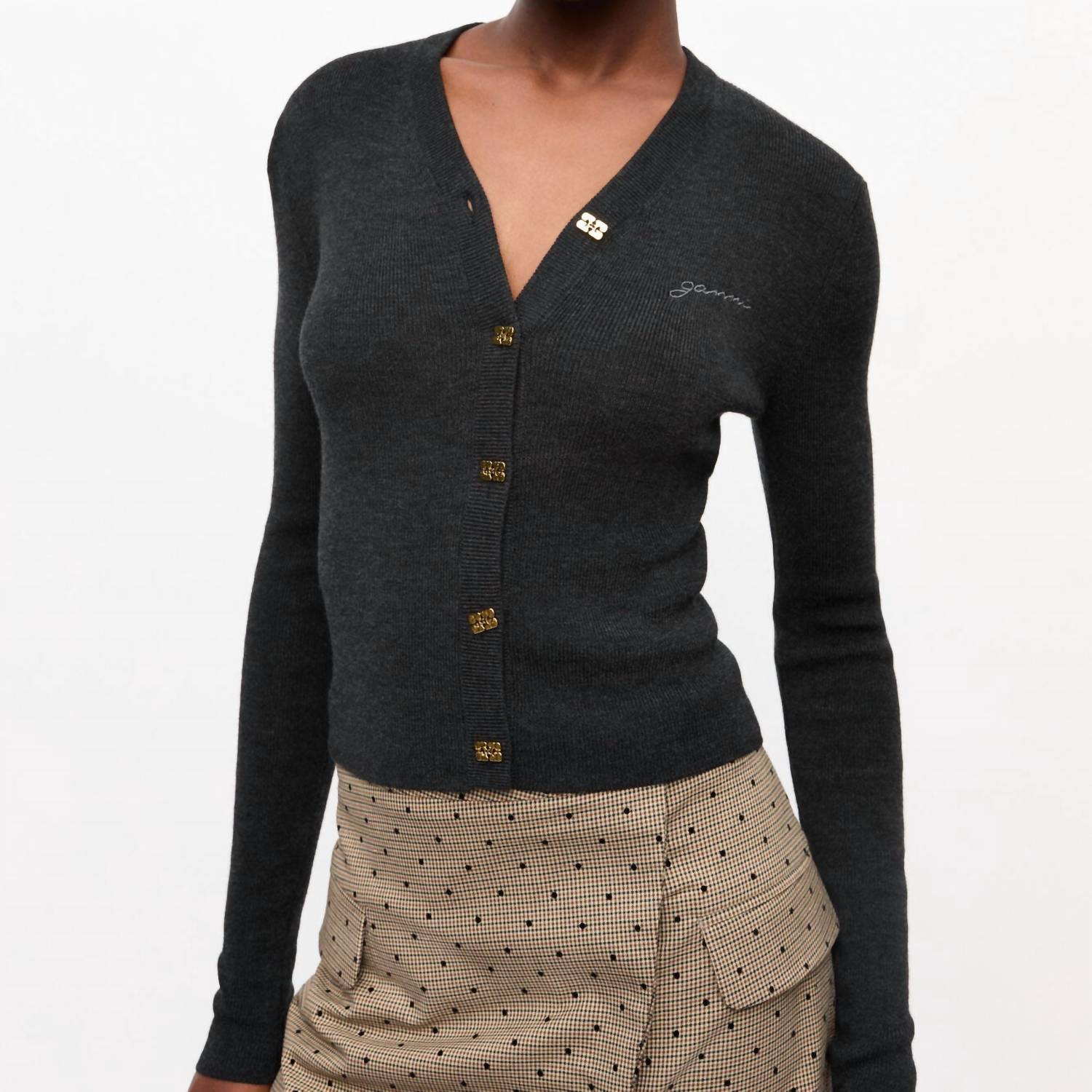 Elevate your wardrobe with the Mini Ribbed Merino Cardigan by GANNI, ideal for women seeking refined style. Crafted from 100% merino wool, this elegant cardigan features long sleeves, a v-neckline, and a classic button closure. The standout embroidered GANNI logo adds a touch of luxury to the Phantom-colored piece. Perfect for adding sophistication to any outfit.