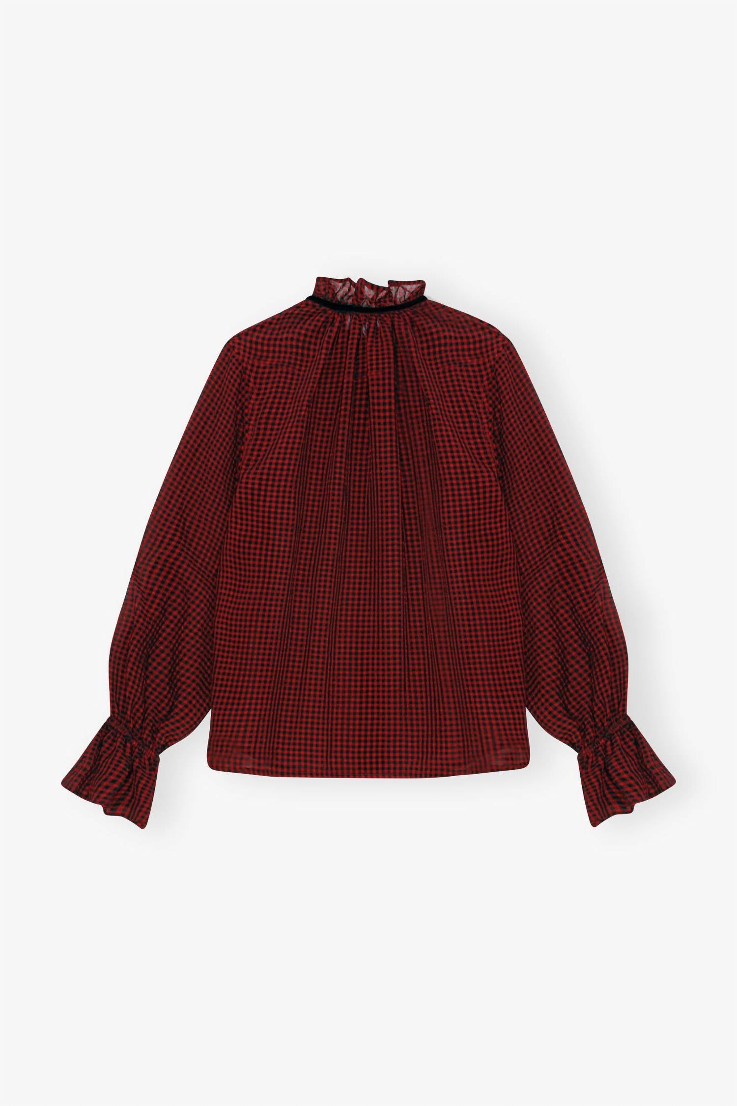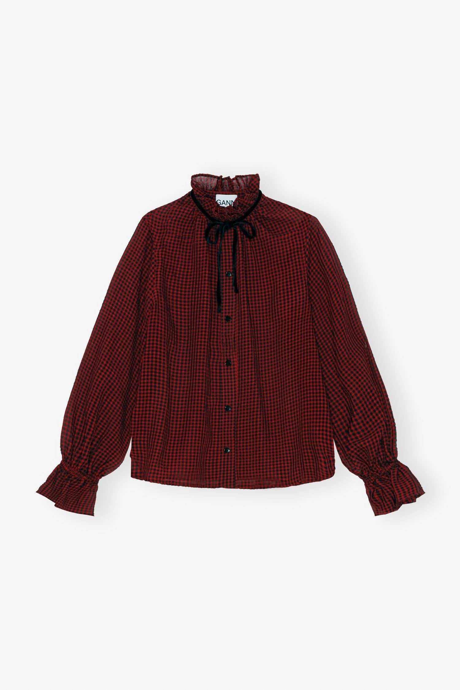 A versatile blouse that works from desk to dinner! Introducing the Red Sheer Tie String Shirt by GANNI, a stylish choice for your next dinner party or Christmas event. Crafted in China from 100% recycled polyester, this blouse features long sleeves with elasticated cuffs and ruffle trim, complemented by a high ruffled neckline with a bow detail. Closure: Button closure. Care: Machine wash cold, do not bleach, do not tumble dry, iron low, do not dryclean. Model is Ariunzul, height 176 cm, wearing size 36.
