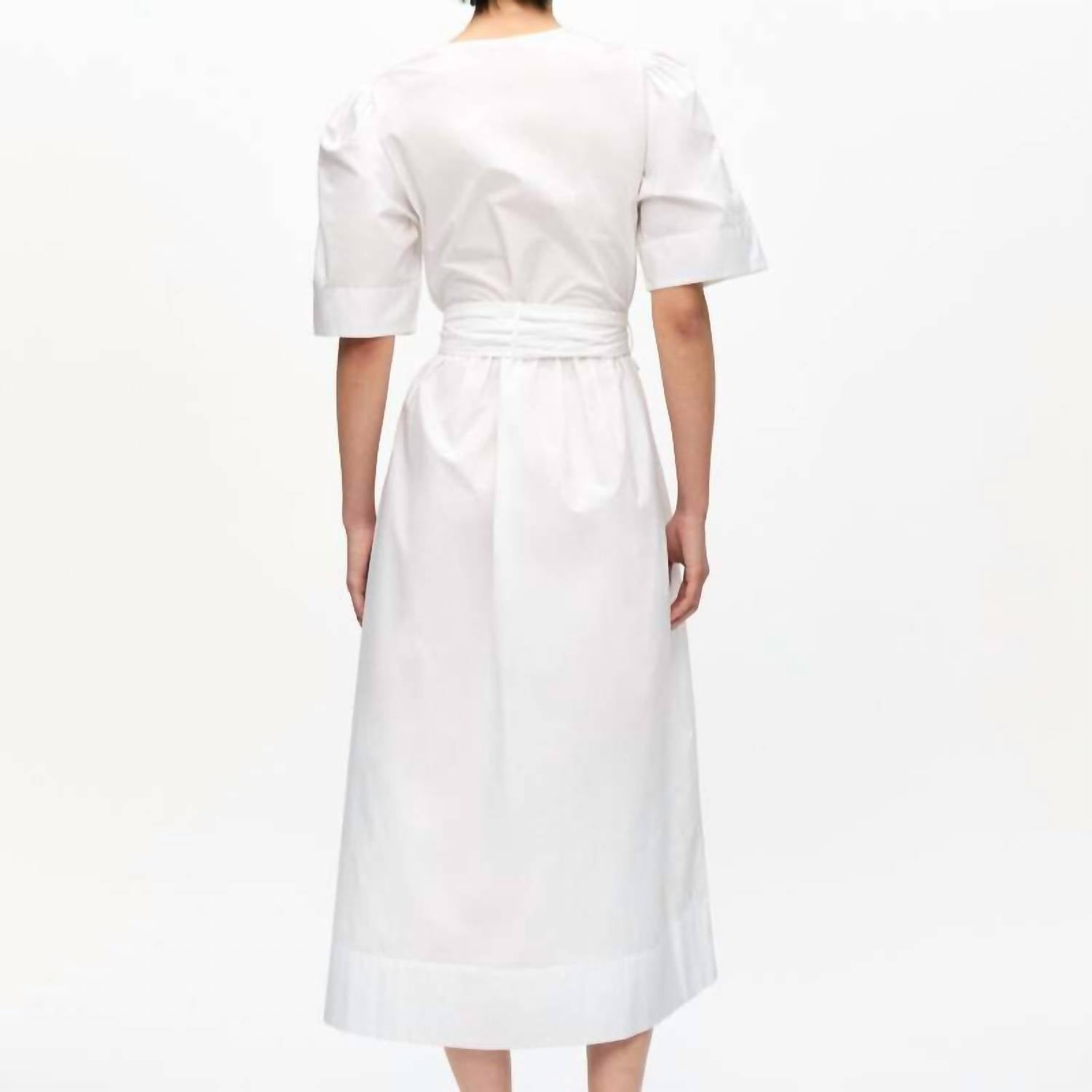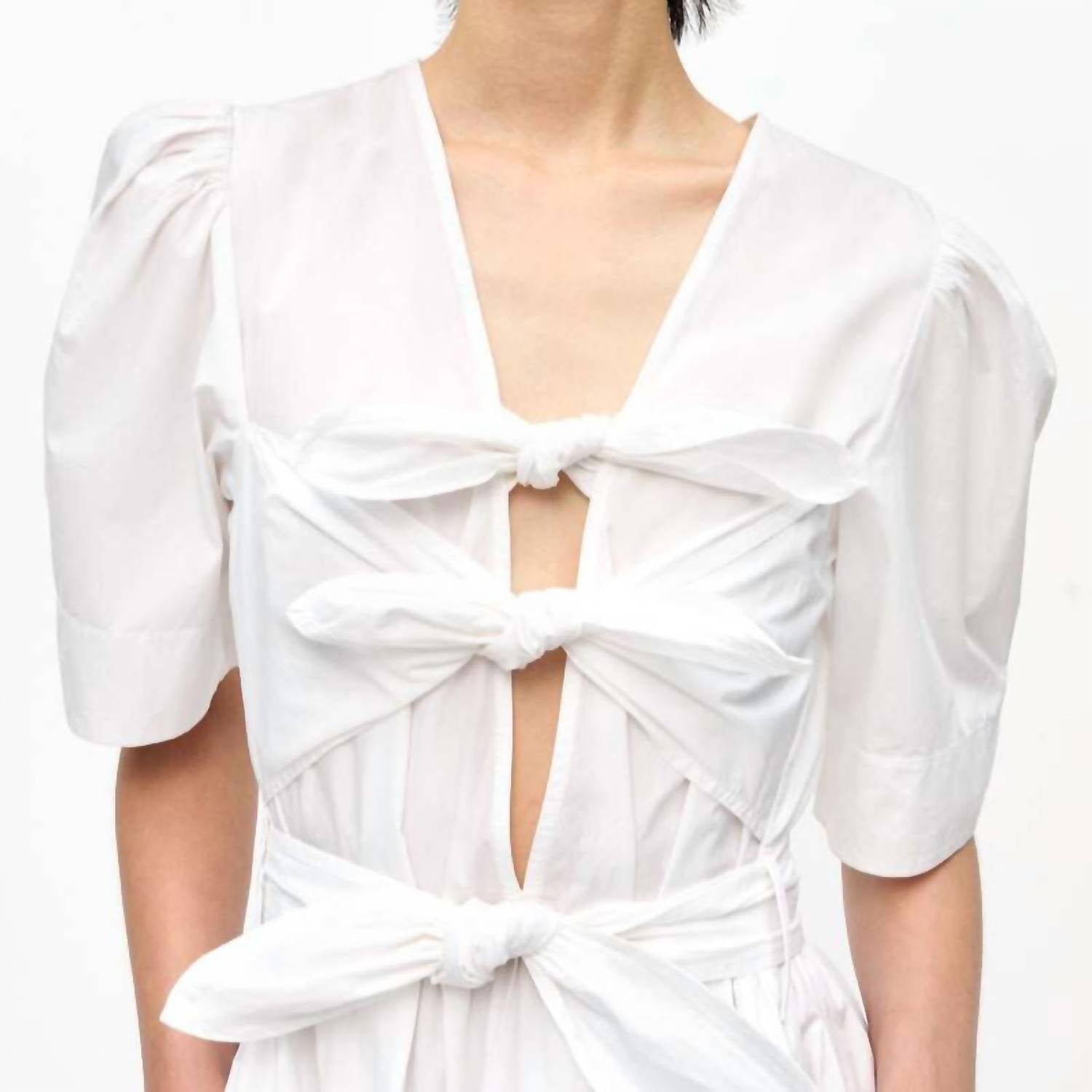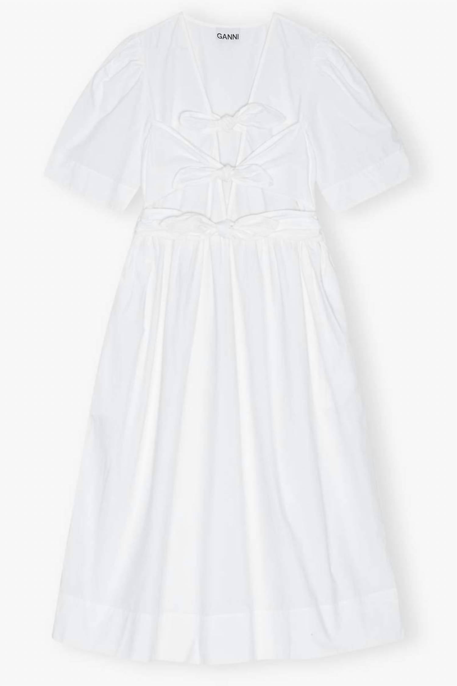 The Ganni Washed Stretch Midi Dress in Bright White is a perfect blend of comfort and style for your summer wardrobe. This women's midi dress features short puffed sleeves and is crafted from a 97% Cotton and 3% Elastane blend, ensuring a comfortable yet structured fit. It boasts a deep V-neckline with three tie bands at the front and includes convenient side pockets. Designed with a tie closure, this A-line dress includes belt loops and a flared skirt for a sophisticated silhouette. Care is easy with machine wash cold instructions, but be sure to avoid bleach and tumble drying.