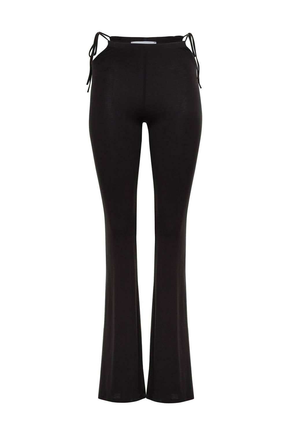 Stay on trend with these stylish boot cut pants that are fit to perfection. The perfect combination of comfort and fashion, you'll be grabbing for these all season long! Timeless style meets modern flair. Slim, flared leg pants. Crafted from luxurious modal fabric. Feature a high-rise waist with side cutouts and strings for an eye-catching touch. Offering a sleek, floor-skimming silhouette with a 36.5" inseam. Perfect for making a bold statement. Made in US. Slip on effortlessly with a tie closure. Ensuring both comfort and style.